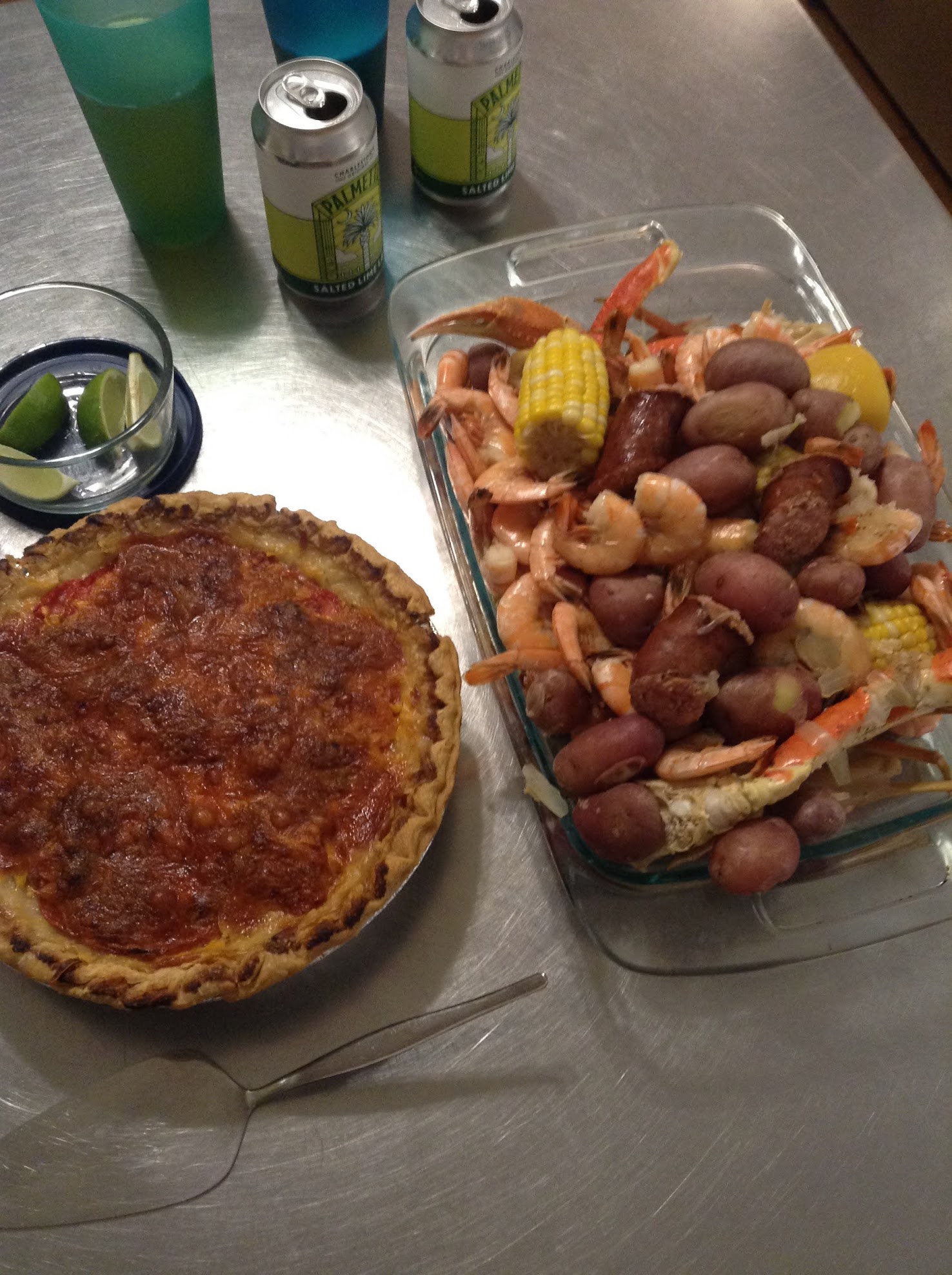 - Low Country Boil. Easy and delicious. - snow crab (Not local. But blue crabs aren’t in season yet.), shrimp, sausage, corn, potatoes.
