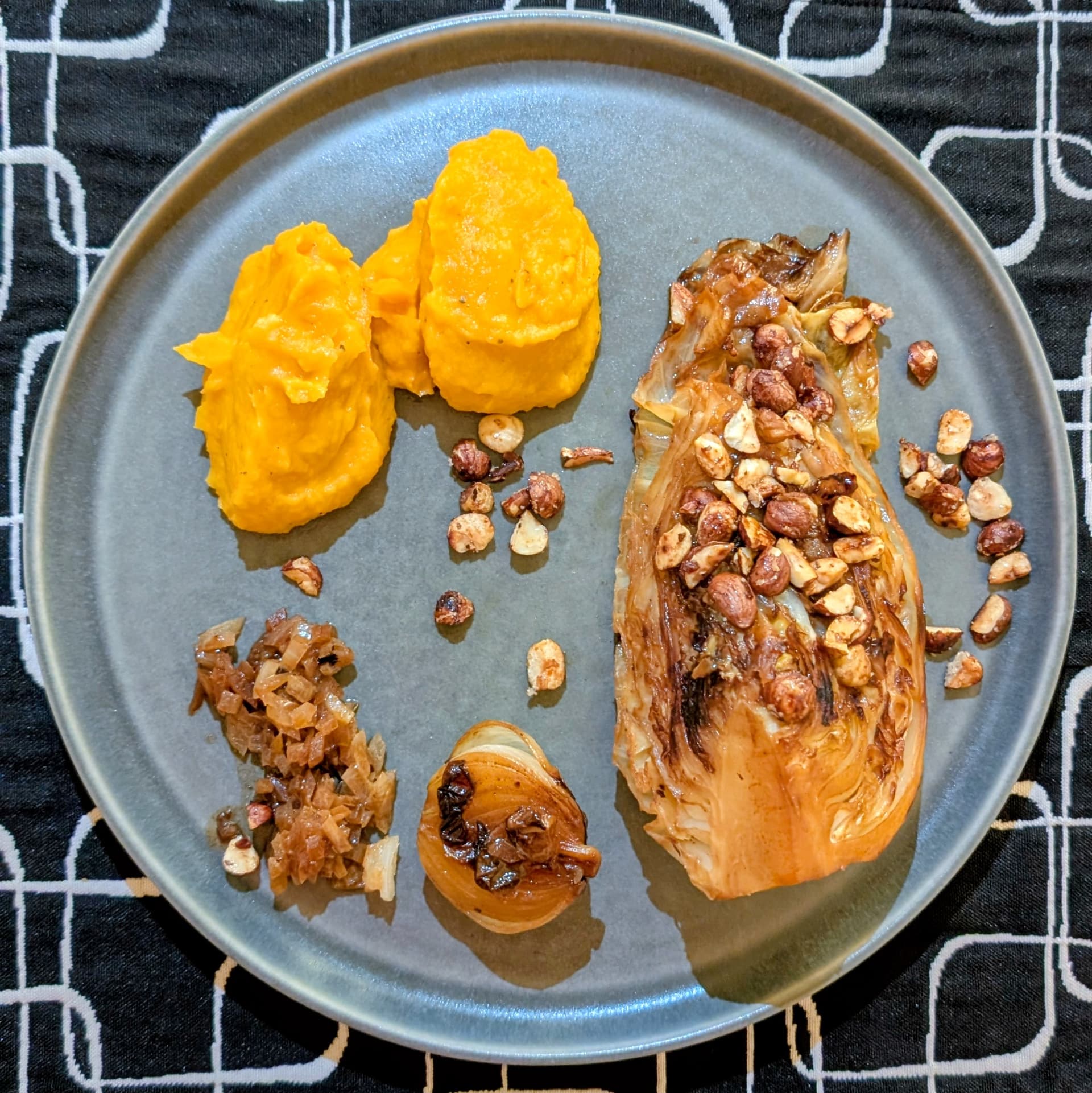 Had something similar in a restaurant a while ago and thought to give it a try. Braised pointed cabbage with sweet potato mash, balsamic caramelized onions and roasted hazelnuts