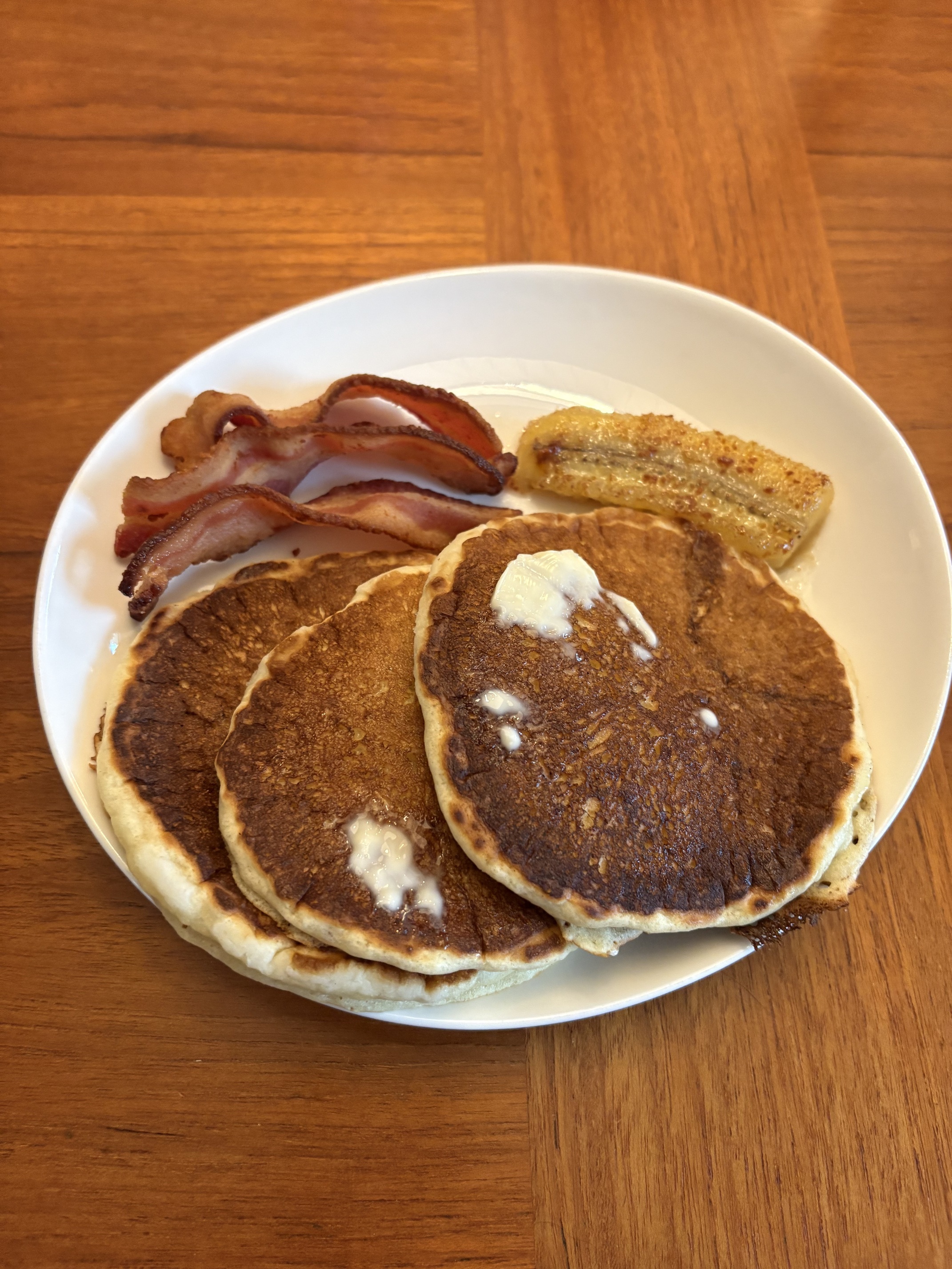The humble American pancake, served up with bacon, fried banana, butter and maple syrup.