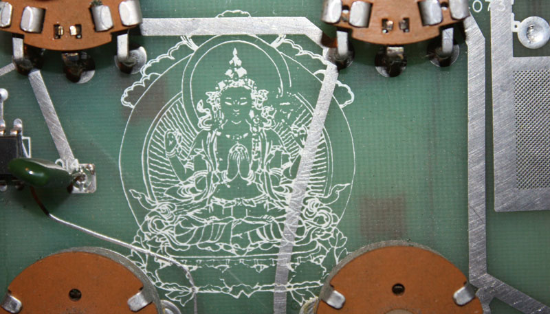 The buddha is printed, of course, and the shrooms are solder if I recall.