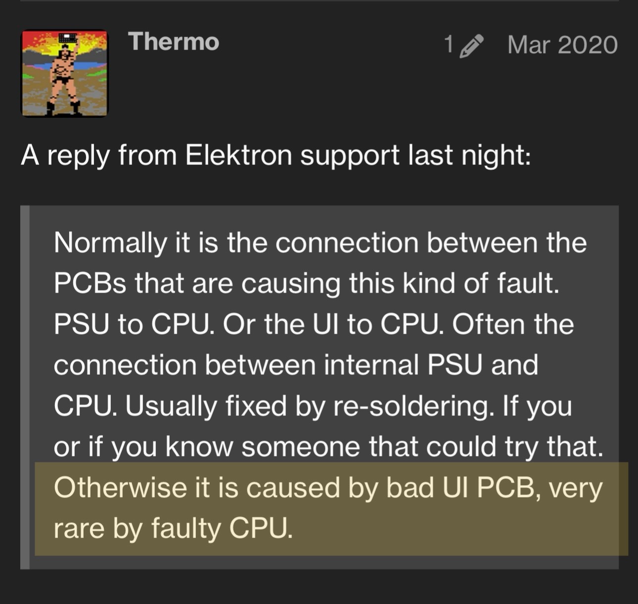 ISO: Someone familiar with repairing machinedrums in Canada or US if possible. No repsonse from Elektron Usercare and I believe they don’t services these anymore. I have a SPS-IUW+ MKII, which has intermittantly been working. I have gone through all the steps of reseating ribbon cables, replacing batteries and even ordered the new PSU-2b power supply. Unit will work for a week, then stop booting up. I used to have have the black screen, now it just pauses and flashes the elektron symbol. Running X.11, but had issues with unit while running the official firmwares. It was bought off a friend who hadn’t used it very much at all and likely the capacitors aren’t holding much of a charge. Any tips would be appreciated!! Unit must never go to the landfill.