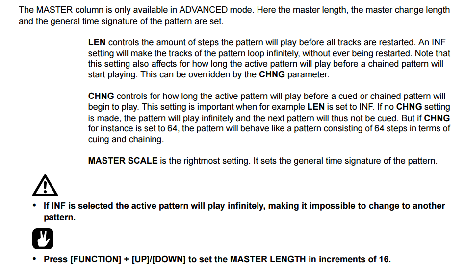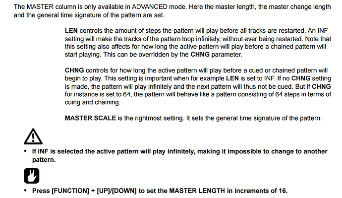 Despite what the manual (and support) says, if Master is set to INF, the pattern will change after CHNG steps as long as you Cue the next pattern and don’t use Chains or Song mode.