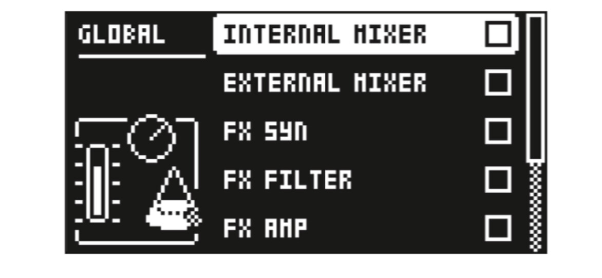 In the GLOBAL FX/MIX menu, you can select several parameter pages whose parameters will (when selected) act on a global level instead of on a pattern level. Then the parameter’s settings on that page will not only affect the active pattern but will also affect all the other patterns in the project. The parameters text/ value graphics are then inverted. Use the [LEFT]/[RIGHT] keys to select or deselect the parameter pages you wish to function on a global level. For more information, please see “13. FX PARAMETERS” on page 59.