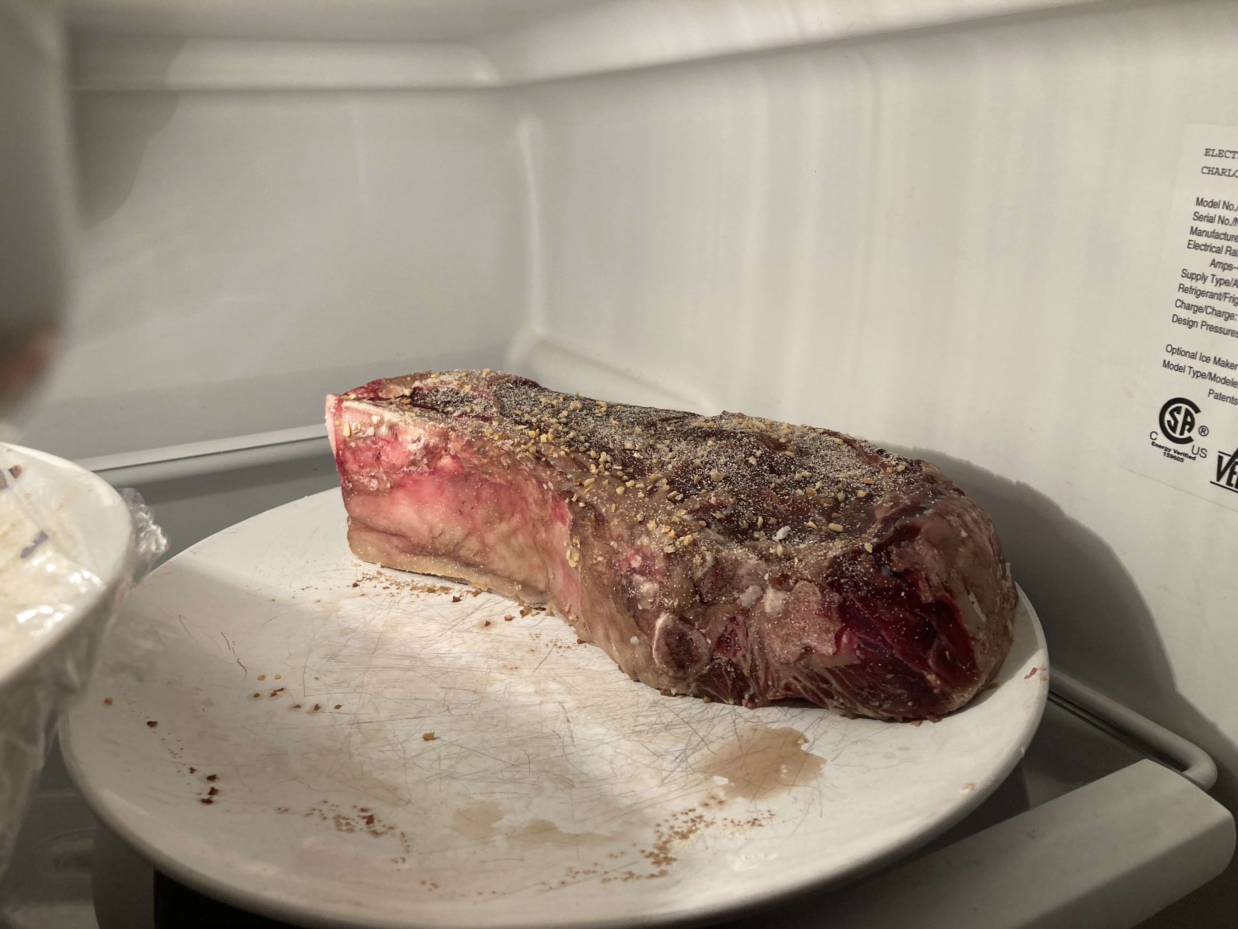 I know it looks weird, but it’s been there for about a week. I prefer my meat aged. I like to let it get nice and funky then I fry it in peanut oil and brown butter. So good. It’s going in the pan tomorrow.