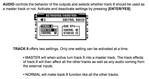 In the PROJECT > CONTROL > AUDIO menu, set the function of Track 8 to be āMasterā (page 36 of the manual). Exit the menus.