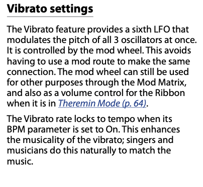 I read the Vibrato is engaged via the Mod Wheel in the pdf manual page 64
