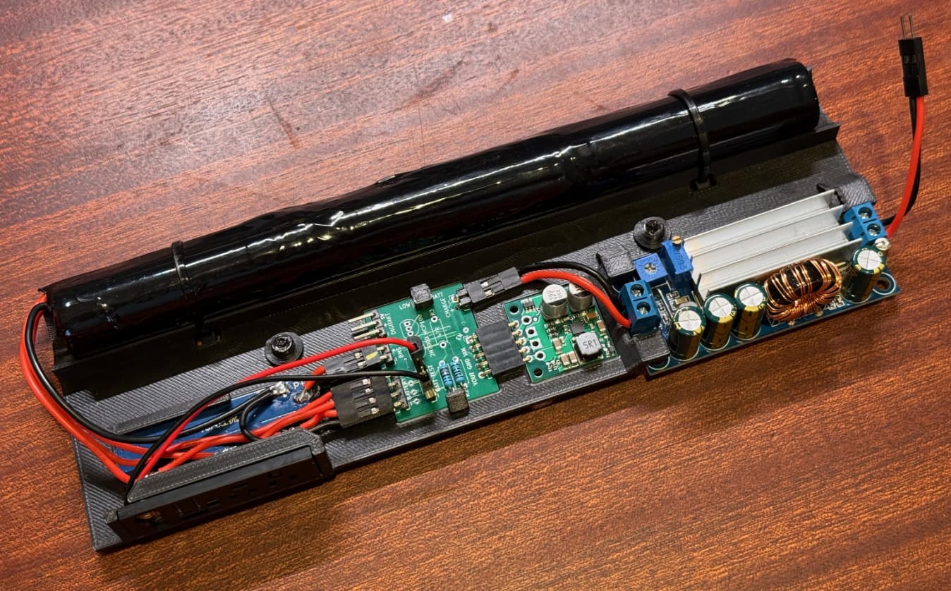 I like to bring my Digitakt downstairs and just fiddle with it on my lap in the evenings. This isn’t ideal since it requires 12V. Using a 12V USB-C to barrel jack cord and a battery works, but it’s still some extra junk you have to cart around. I wanted it to be totally self contained. After finding some photos of the internals I saw there’s a huge empty cavity in there. The hard part was going to be figuring out how to convert the variable voltage coming out of the battery pack (ranges from 12.6V when full to ~8V when empty) into a steady 12V.
