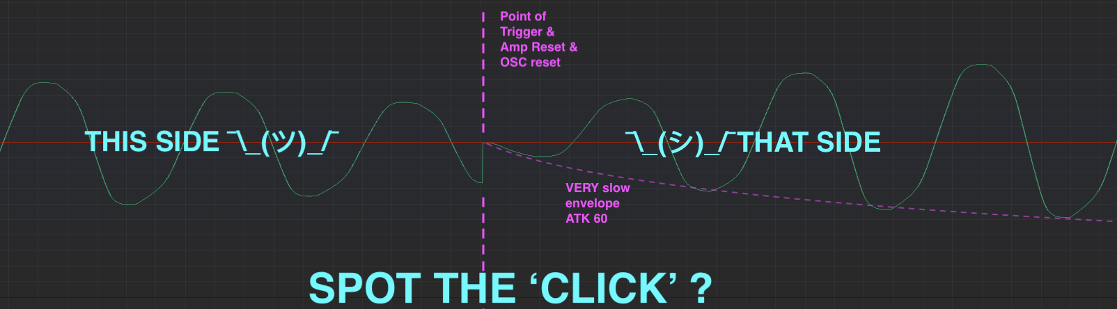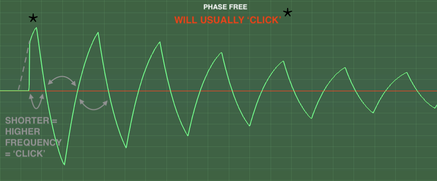 Consider the truncated (dashed triangle) wave-period ahead of the reset phase oscillator with ANY amp profile - you generally create a āhigher frequencyā perturbation that will be more or less obvious depending on when the new note is requested ⦠the lower the frequency either side of the transition, the more obvious, the interruption impact is arbitrary (thus inconsistent) and largely unavoidable