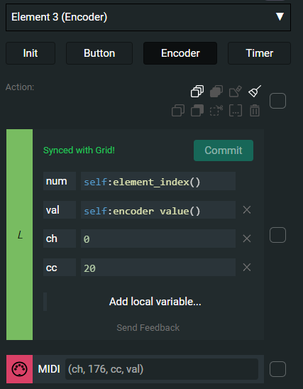 This is just a quick example of an encorer setup. You can see 4 local variables defined at the top and one MIDI block that’s referencing 3 of those variables (The variable ‘num’ is assigned the value of self:element_index() which is the physical position of the encoder. This is used for the LED).