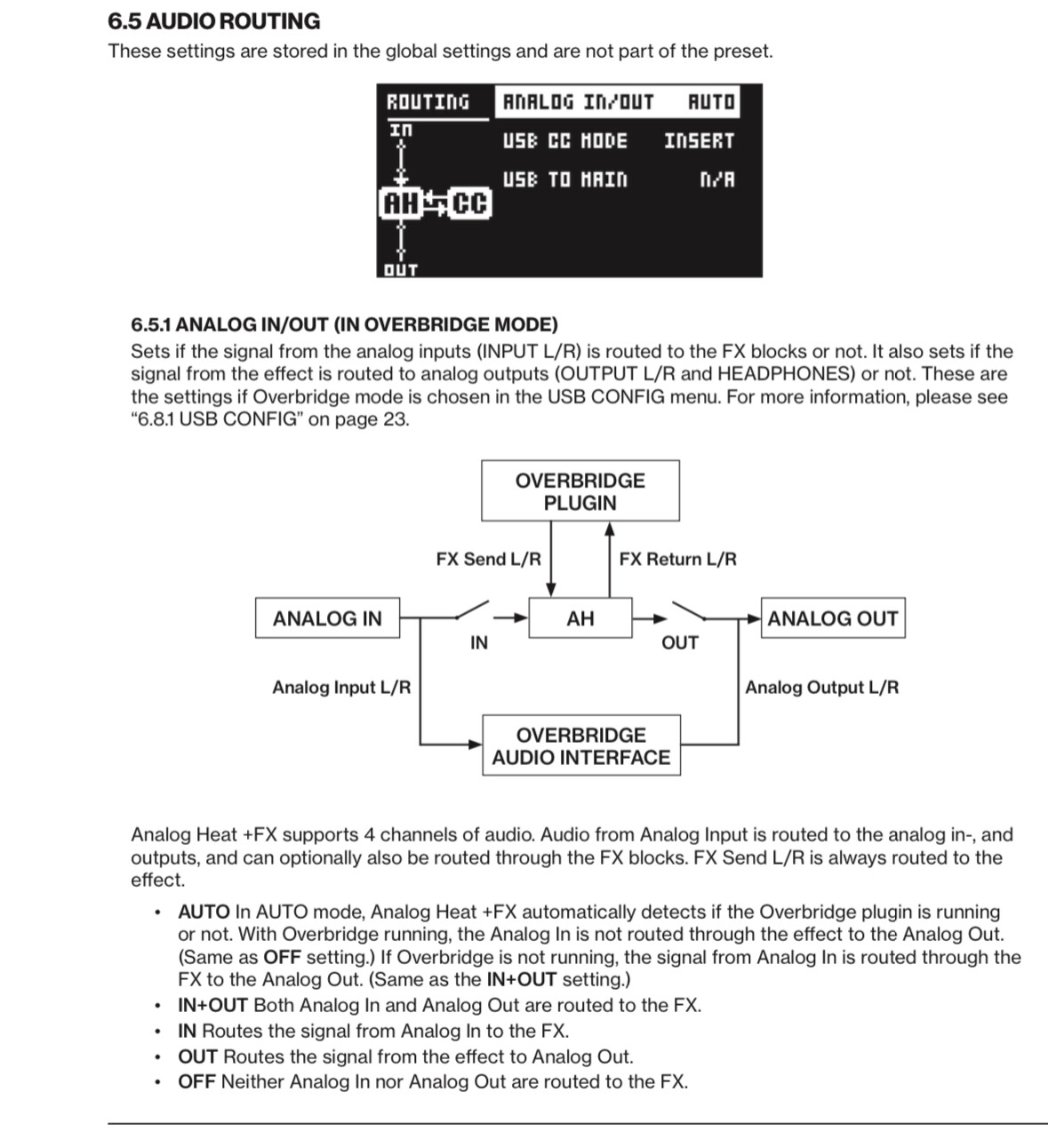 Not sure what I’m missing, but I can’t seem to use overbridge while sending an analog signal into Heat + FX. I’m pretty sure I was able to use it on the Heat mkII (maybeI’m making that up and thinking of other elektron boxes…), and adjust my modulation there on the larger screen rather than the tiny one. If I have it set to USB or audio and USB then obviously overbridge isn’t accessible, but if set to overbridge then I can’t hear my music going into the Heat + FX via audio inputs. Anyone?