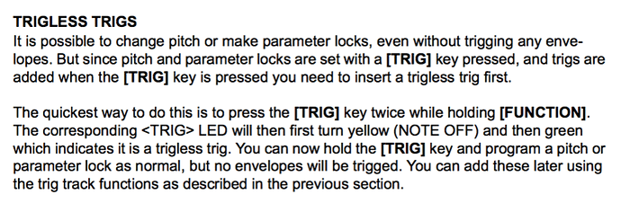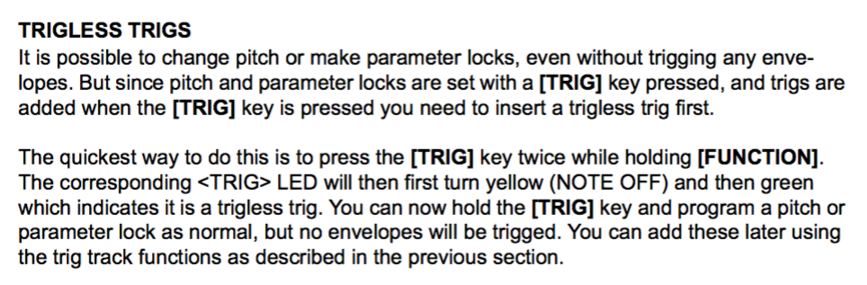 When in fact all that is required is a trigless trig, to then hold and make a trigless lock (a parameter lock, p-lock, for all intents and purposes) of some parameter or other without trigging the amplitude envelope.