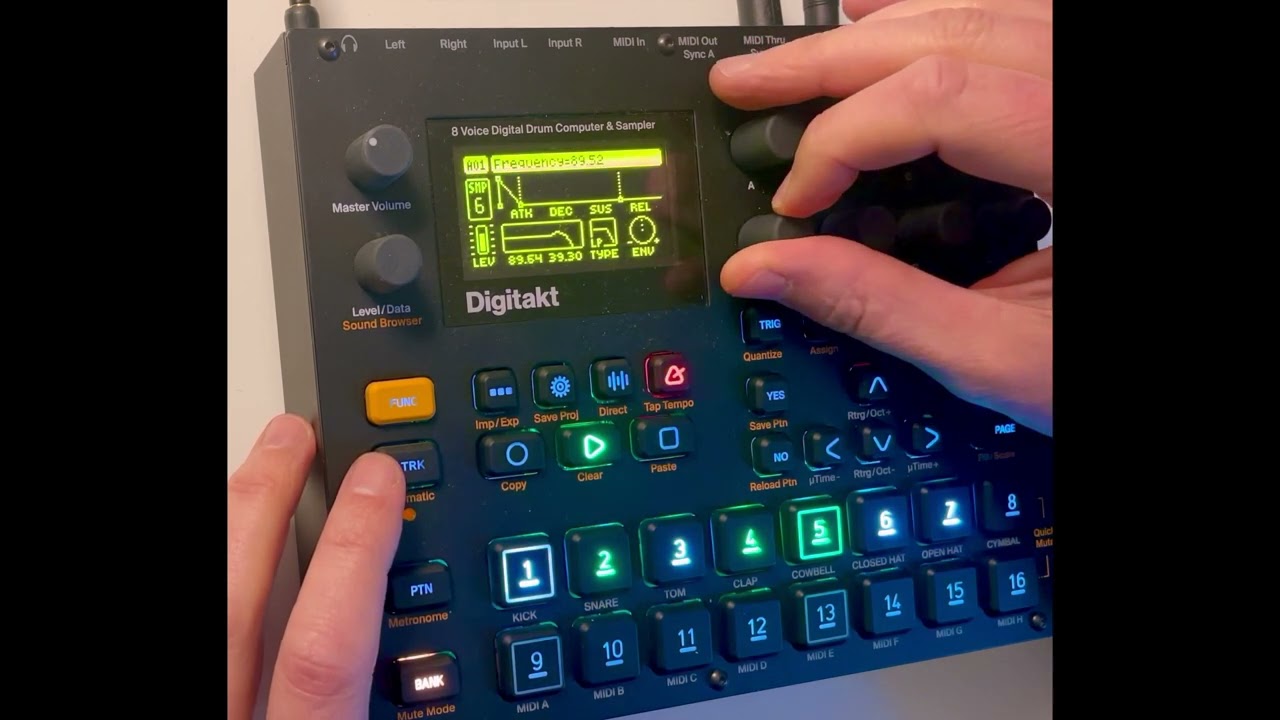 DFAM’s sequencer is driven by notes from Pyramid instead of clock. It makes the sequence more interesting. If step on a Pyramid’s track is filled, DFAM’s sequencer moves to the next step. Otherwise nothing happens.