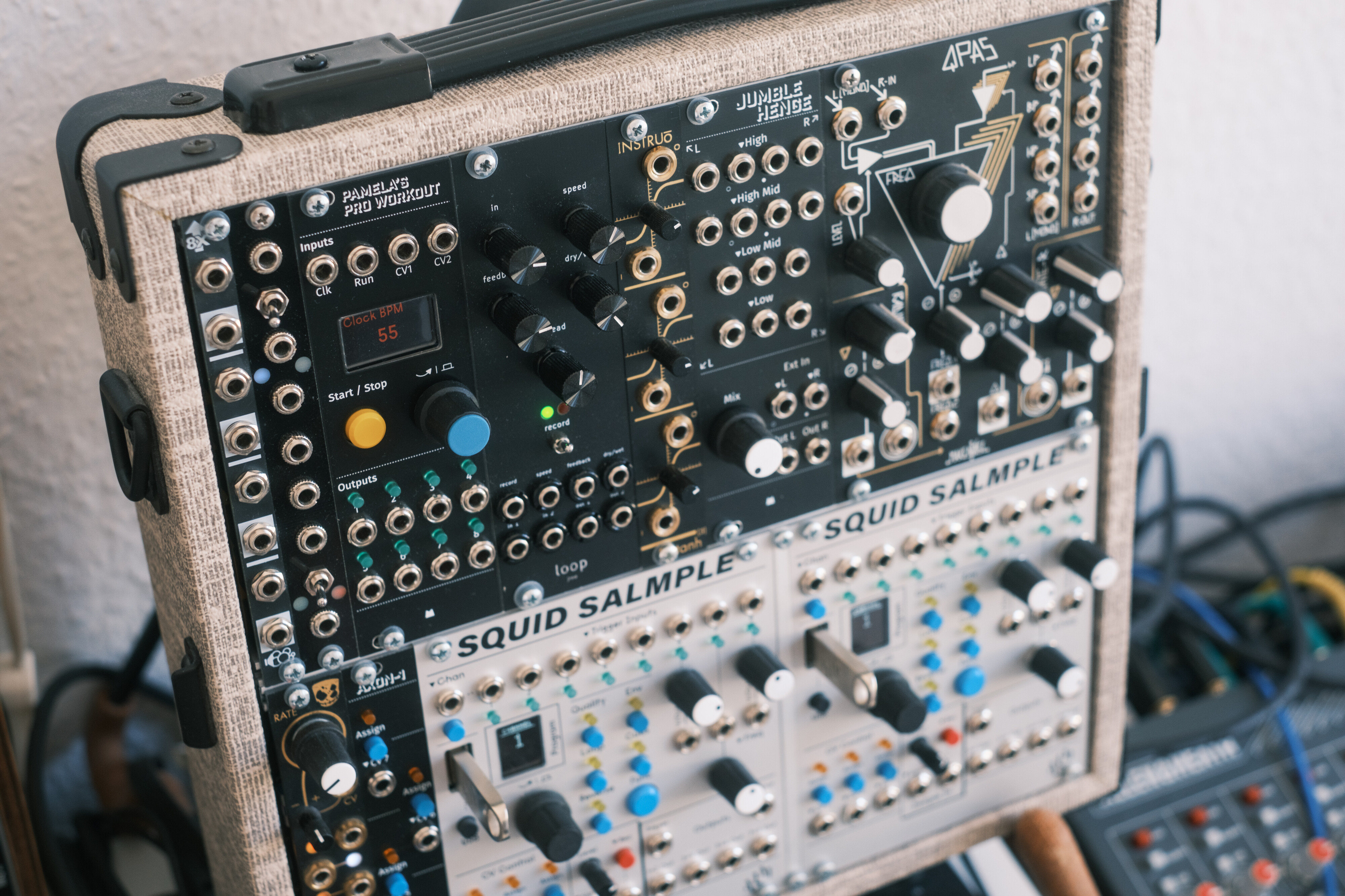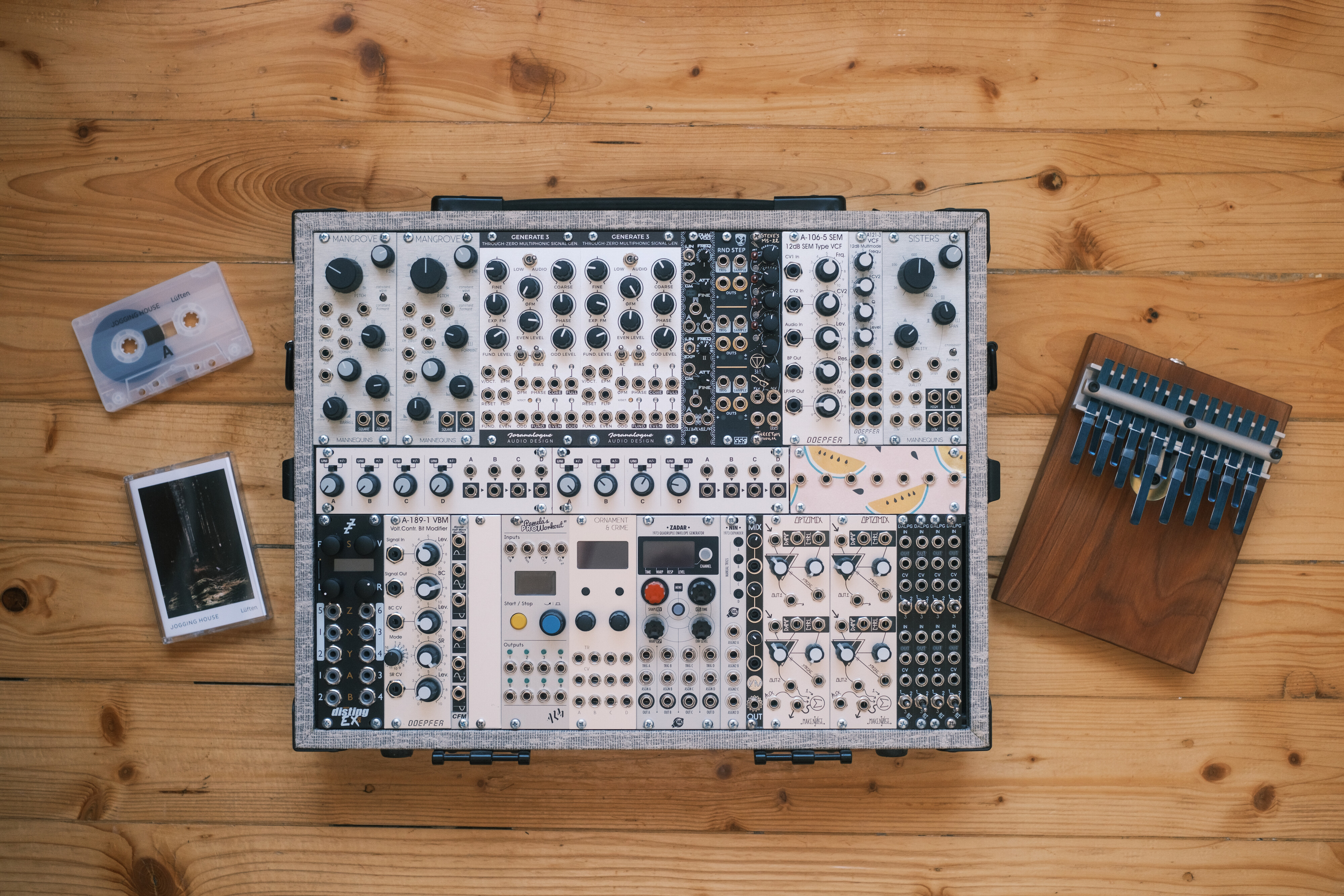 I sampled the Kalimba and a Ukulele into the Squid. All other sounds are analog straight from the oscillators. I don’t habe VCA but many LPGs to fade things in and out.