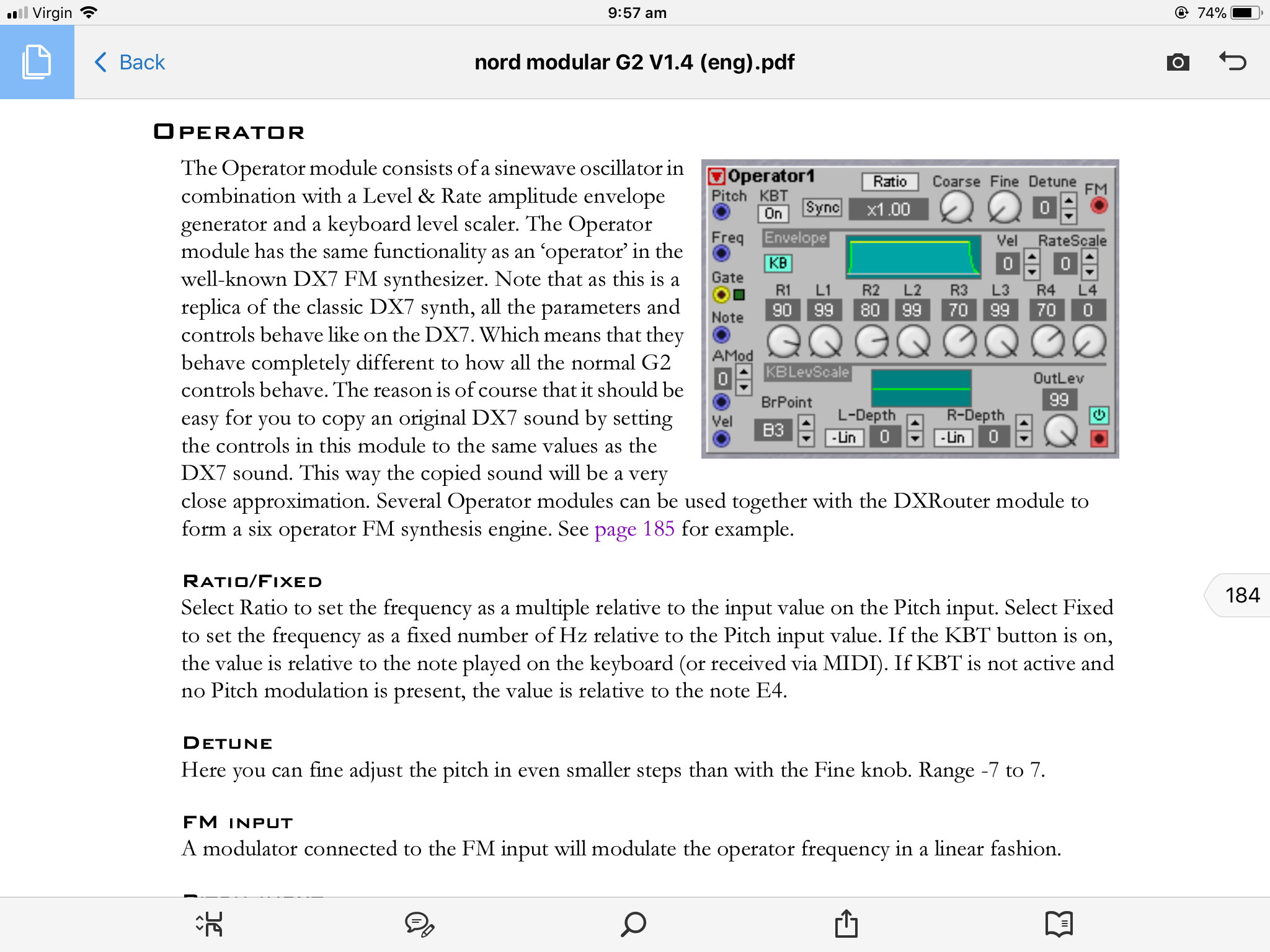 You will notice that the Operator module also has its own integral advanced envelope, essential in traditional FM synthesis, saving having to wire up manually.