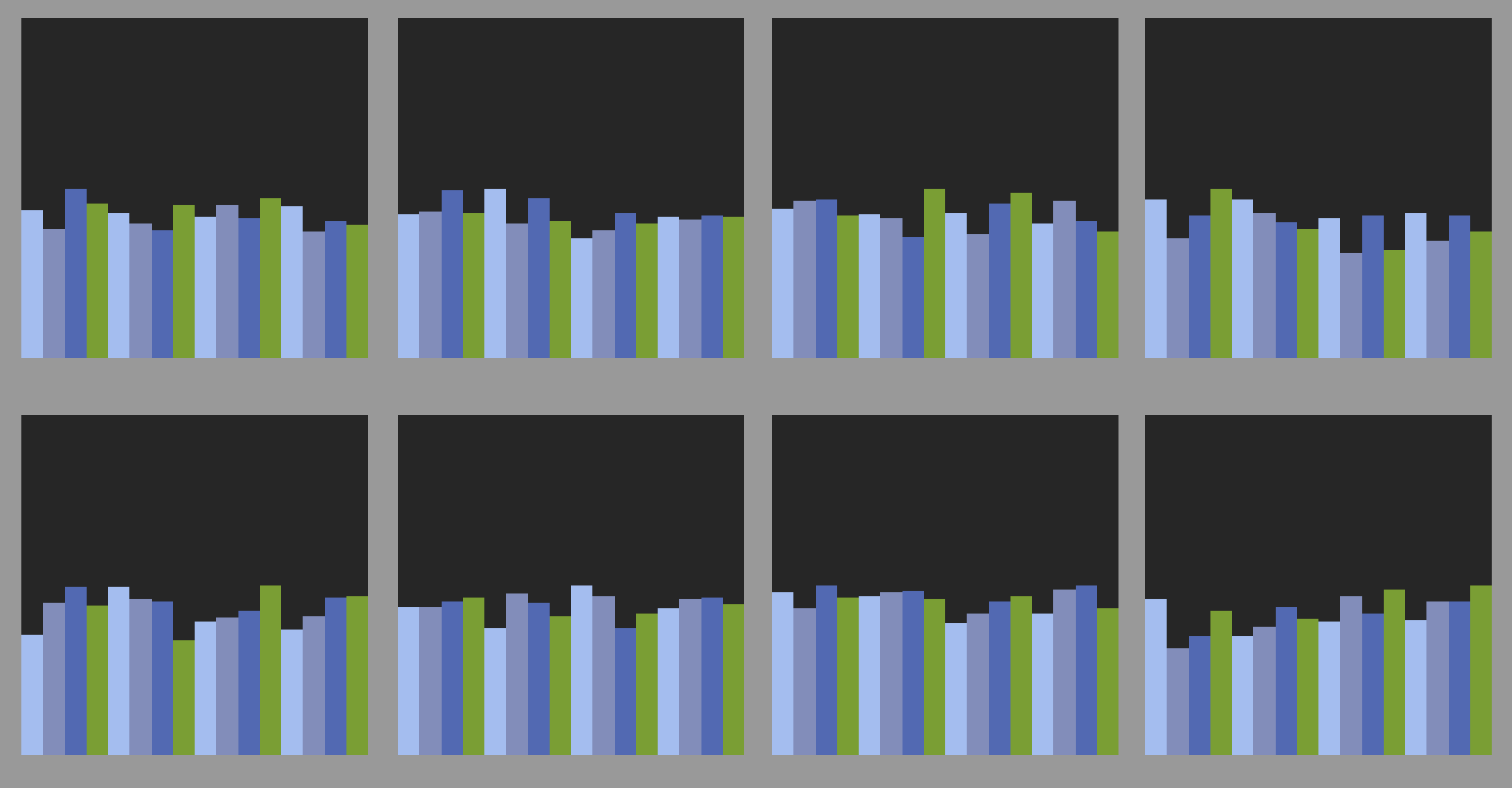 here’s the 8 plots - each column height is a count, the highest column in each plot has reached 128 … the plots show the counts for target values 0 through 15