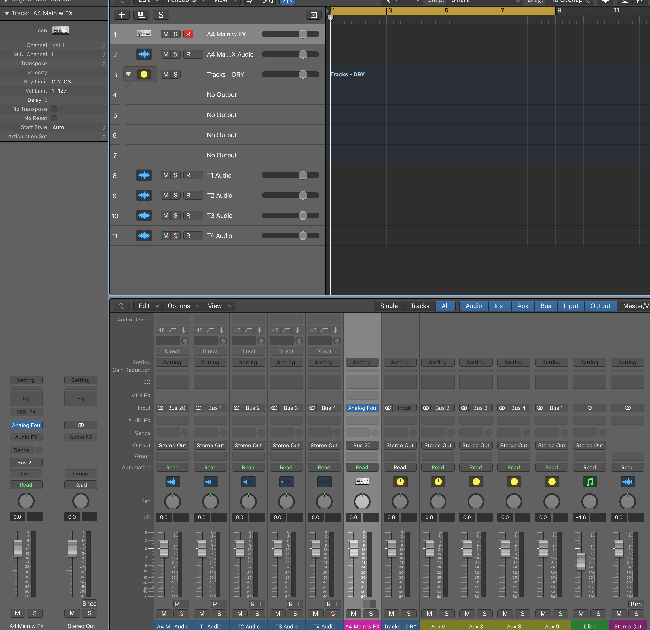 thanks for reply - I managed to build one up from the ground yesterday based on what I’d figured and got it all working lovely - apart from the Audio Summing Strack to mute (the Aux Sum Stack worked fine)… I could record all 4 Tracks Dry or/and Stereo sum with FX… saved as Logic Template - started up today and Logic asks if I want to use A42 (BIt Accurate) whereas I had selected A42 Core Audio (I have the same as you - 1 X Stereo / 5 mono) and then it’s all broken - the Aux racks have ‘No Output in the Sum Stack’ and all the busses are wrongly assigned… my brain hurts!