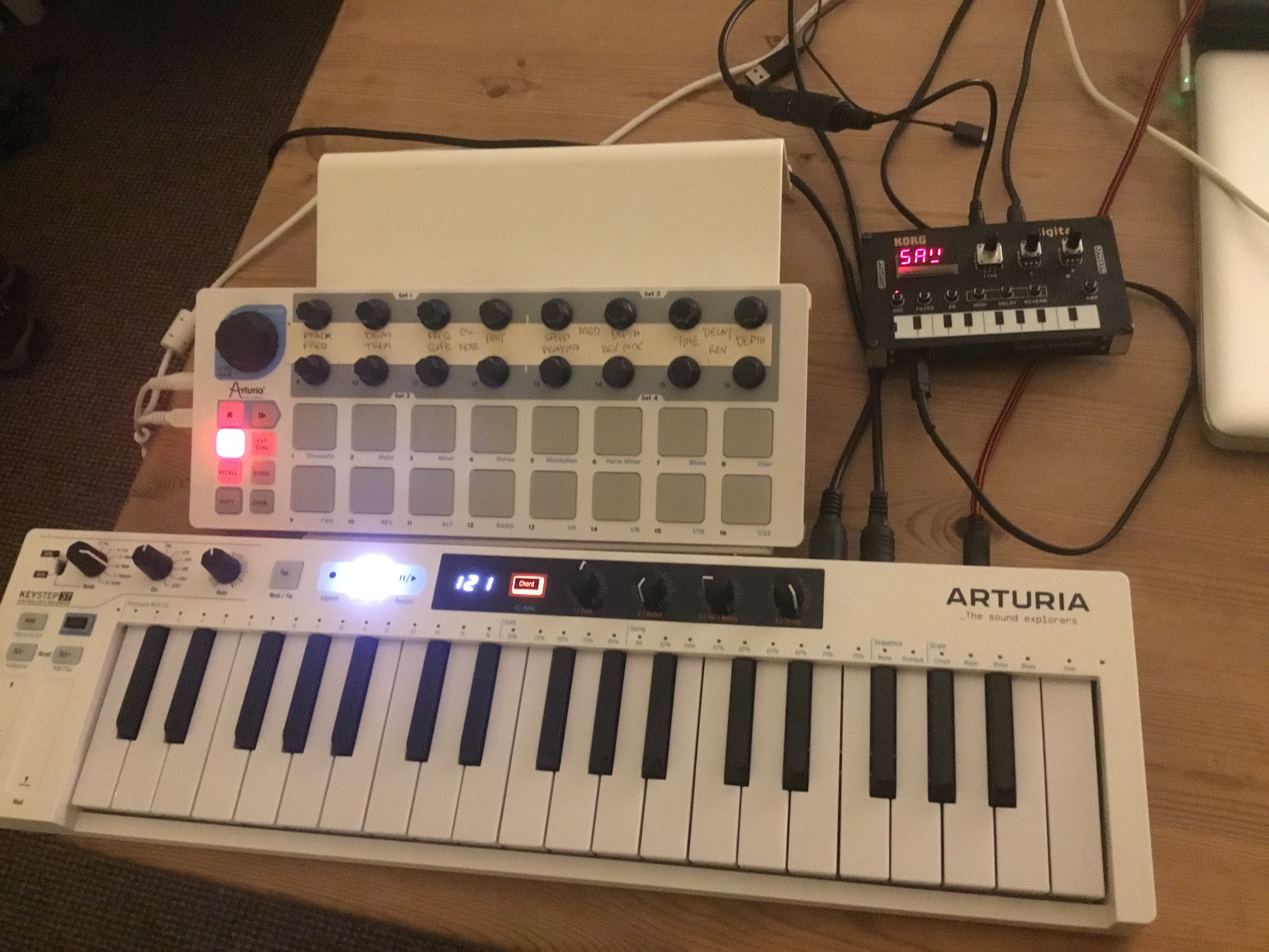 The midi in on the keystep is super useful with Elektrons because you can use MIDI out to send the clock/sync from the Elektron, send the KS midi out back into the Elektron MIDI in so that the Elektron’s MIDI thru basically then sends the Clock and the keyboard output including the sequencer as well as having keys available to the Elektron. In the picture above I’m doing that so the NTS1 is being sequenced by the Keystep.