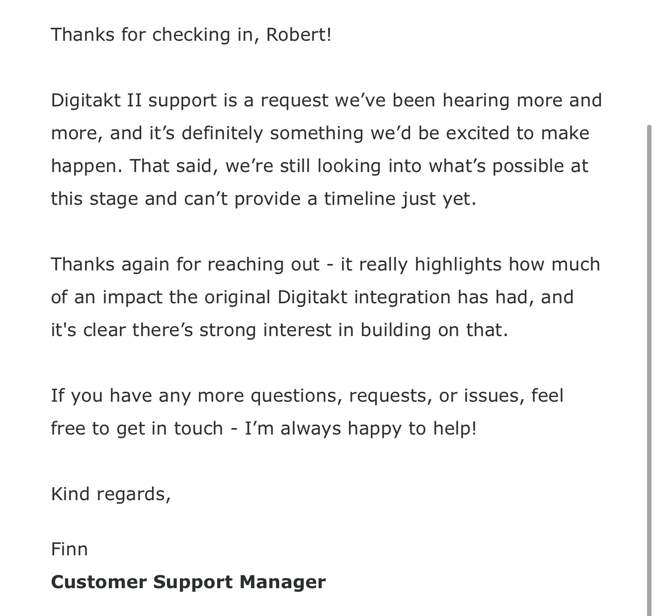 We know there’s been a lot of interest in Digitakt II integration, and it’s something we’d really like to support! While there’s nothing confirmed yet, it’s on our radar and being looked into.