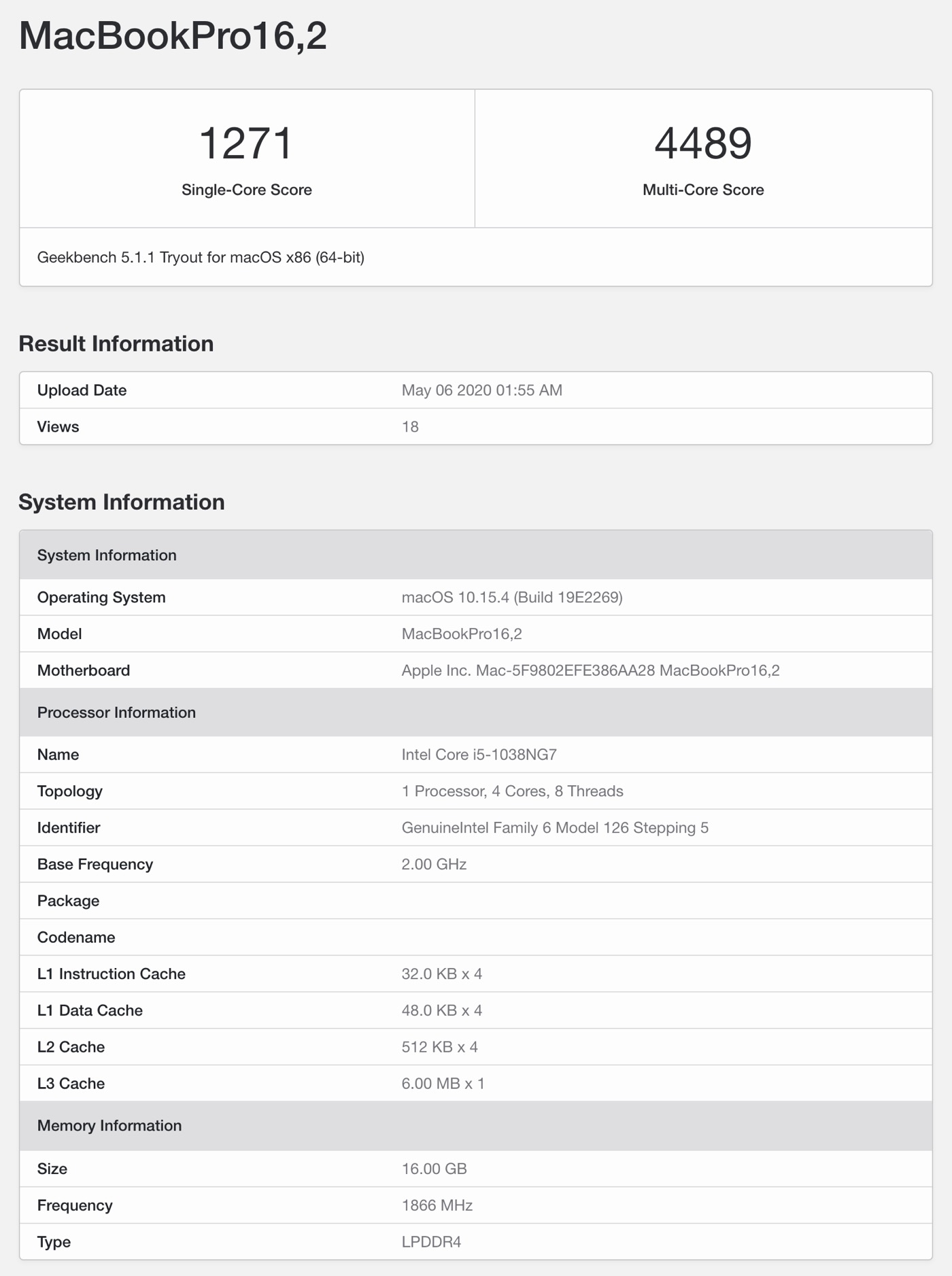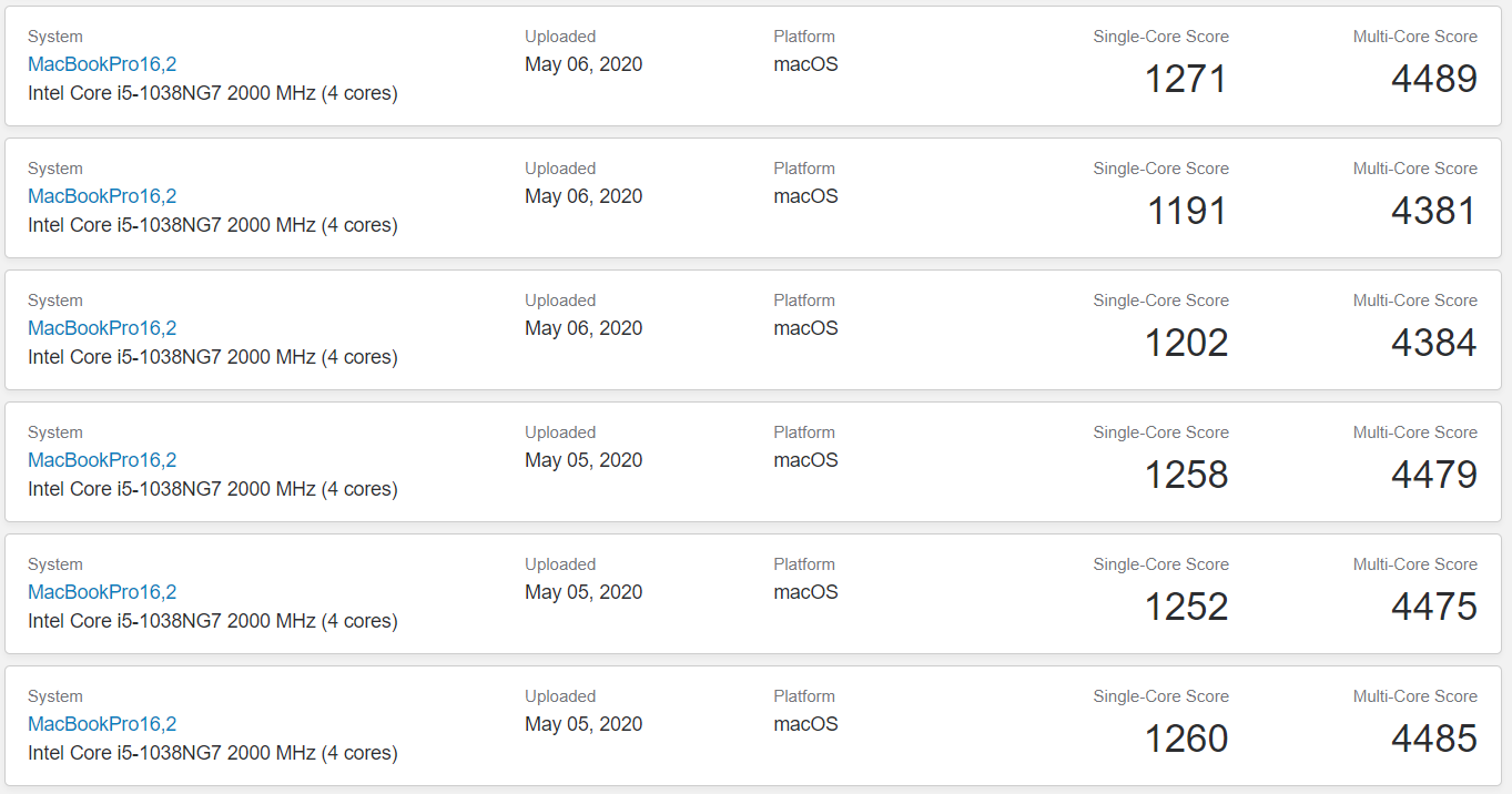 But that’s a great single core score of 1271 (my 16" MBP 8 core gets 1099), and the multicore score is 68% of my 8 core 9th gen i7 16", so 10th gen Intel chips definitely doing their thing: