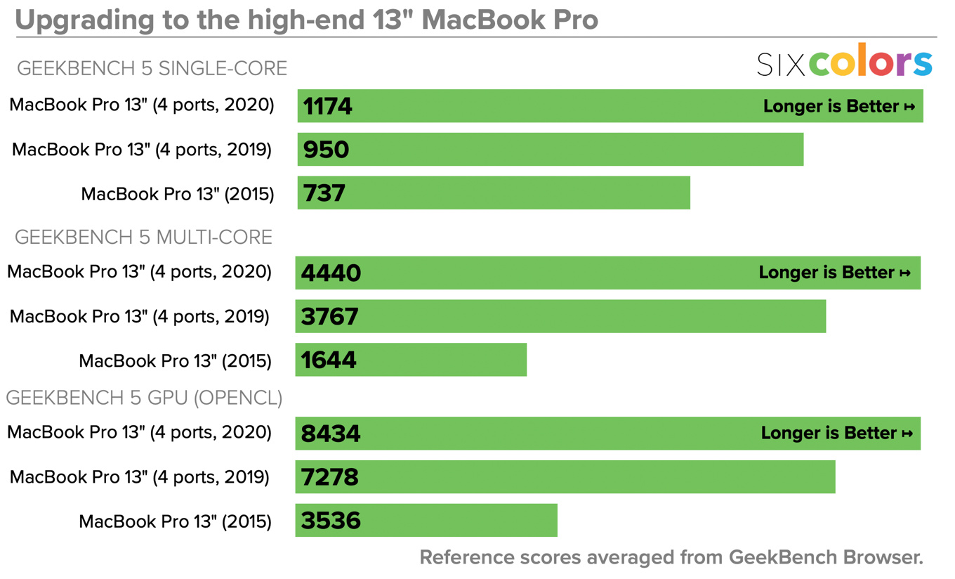 So while not 6 core… the 13" with the new 10th gen 4 core CPUs are almost as fast (82%) as the 6 core 9th gen were in Geekbench 5. And a good bit of that is GPU difference, I’ll try to find more details on CPU vs CPU.