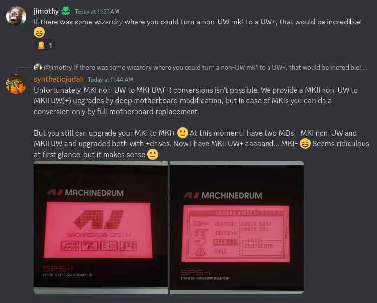 - Upgrading MKII models to MKII UW(+) will add the ability to sample and play samples from memory to your Machinedrum. More information can be found on our Discord channel: Discord.