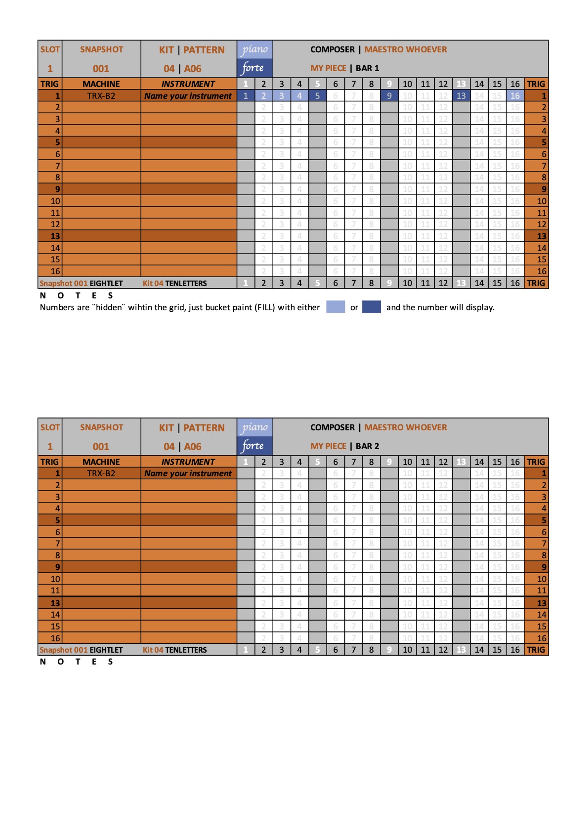 Sharing an Excel displaying 16 instr. trigs x 16 rhythm divisions. A grid specifically designed for the MD. Hope this template is useful ![]()