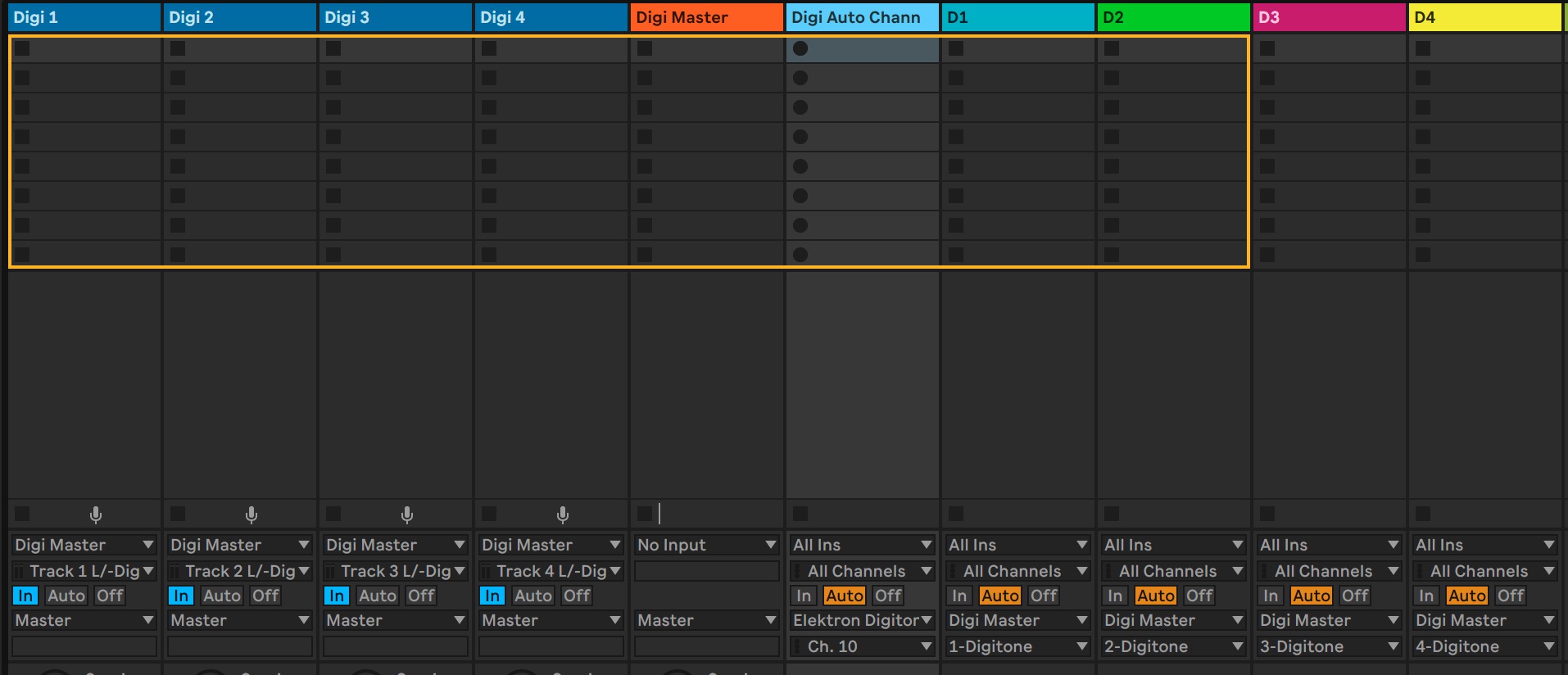 Audio from the Digitone tracks will now play on separate tracks in Ableton, and the effects will play in the “Digi Master” track.