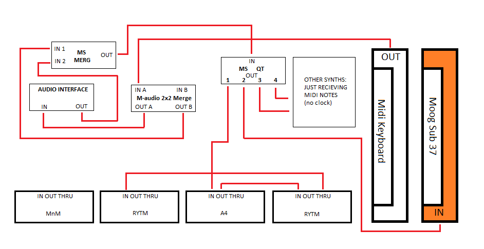 So MnM & 2 Rytms are getting the clock from the A4 and all four receive midi from the keyboard and as thru port output is just a copy of whats coming in the In port you can daisy chain your other stuff off them. And i wouldnt just make one long chain off just one machine because the degredation of midi signals is due to the opto isolators that little light that flashes the data across a physical space to be read by a photo cell on the other side as fast as it is has a ramp time and as i understand it thats what causes problems on long [multiple chained ]systems.