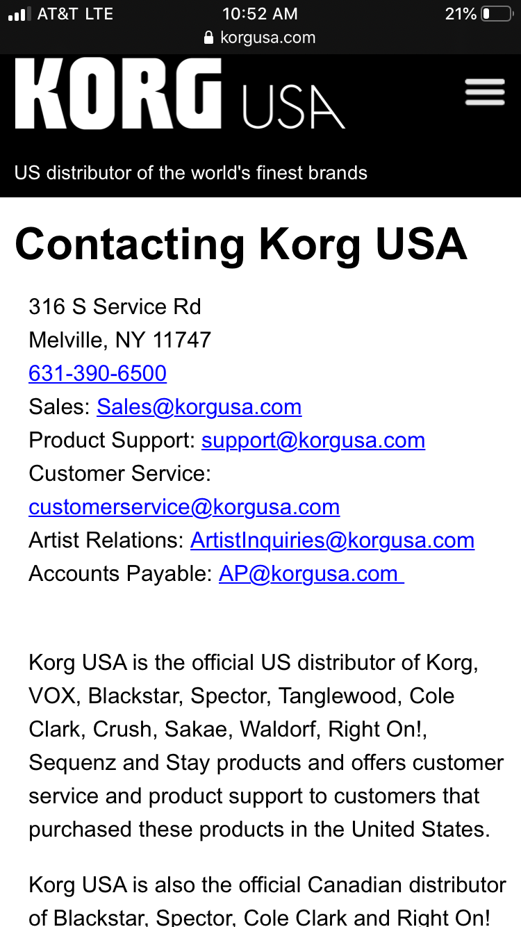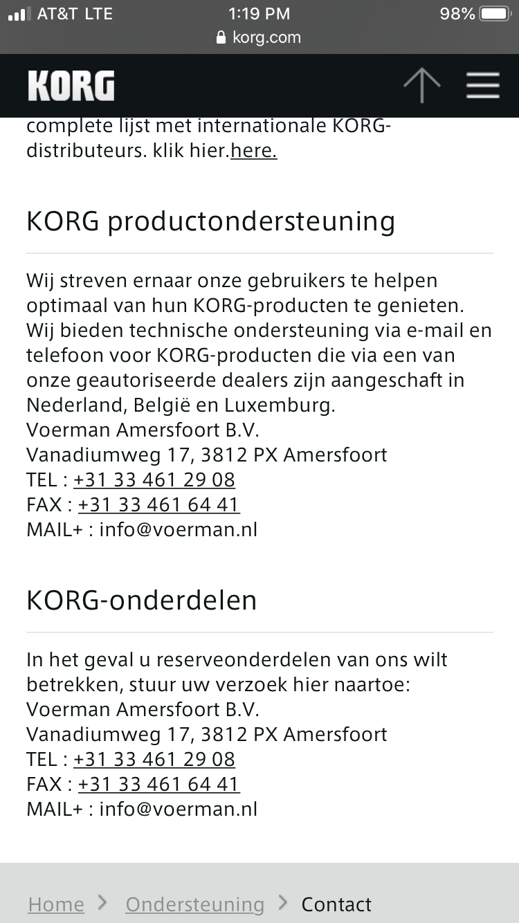 Not sure what you two mean, Korg lists their phone numbers online which you can call directly, and Iāve gotten almost immediate responses from their support email. I donāt know where you are located, but Iām in the US and itās very easy to reach them.