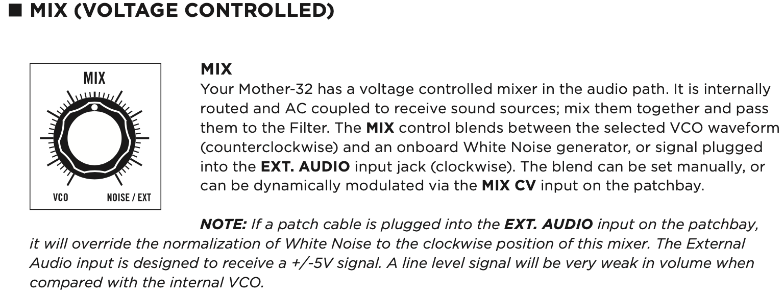 RE: MIX CV Input - “With the MIX control at center position, a -5V to +5V CV applied to this input will crossfade between the selected VCO waveform and the EXT. AUDIO input”