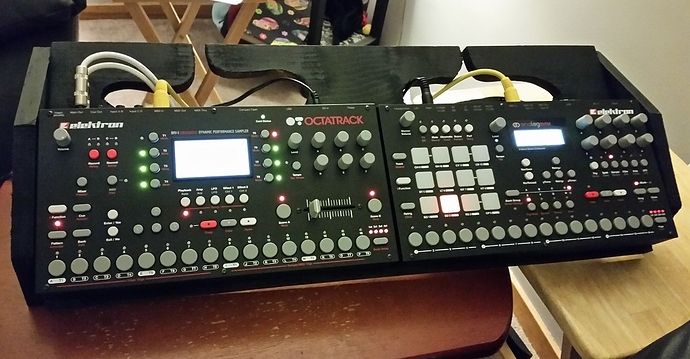 My wife likes it when I am in the same room with her, at times. So… here is my new couch lap groovebox. I have a portable power supply for the Rytm tucked underneath. Just needing to track down a portable power supply for the OT.