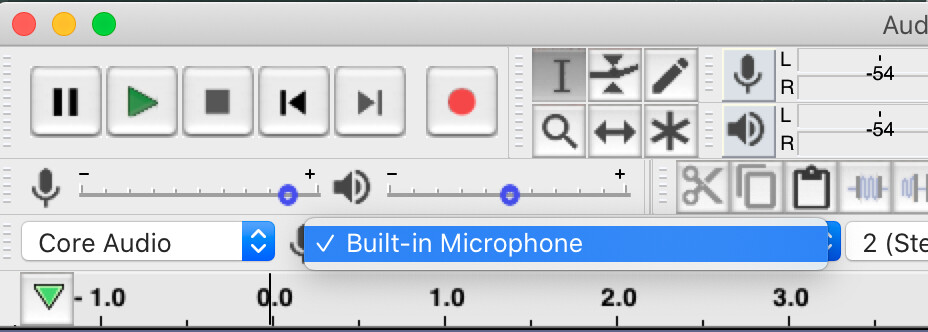 All of this is familiar. You have to click in the top right where it says “Click to start Monitoring” in tiny print. I found that the volume was too high and I don’t know how to change it in Audacity or the Sound pref. Fortunately ctrl-all on the M:C worked but one shouldn’t have to resort to that. If you learn anything please share it here.