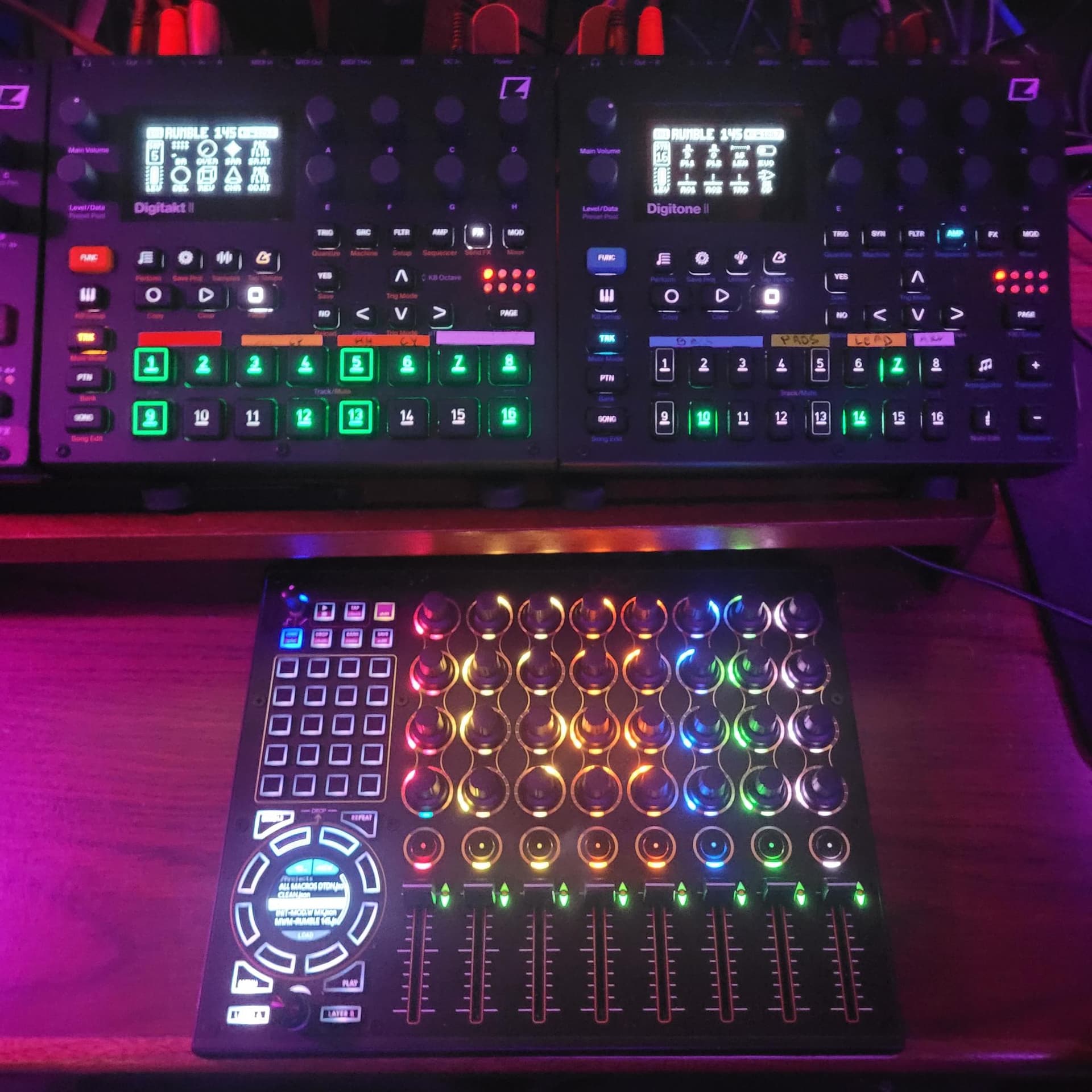 The kicks are red, on the Digitakt (CH1,2,9,10), the Red column Encoders offer all macros (Mode Wheel, After touch, Pitch Bend, Breath Controller, Fader controls volume on all kicks.