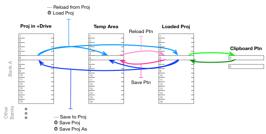 The pattern menu Reload from / Save to affect just one pattern. The Settings menu Load / Save affect all the patterns. All these operations afftect the Temp area, setting it the same as what is stored in +Drive.
