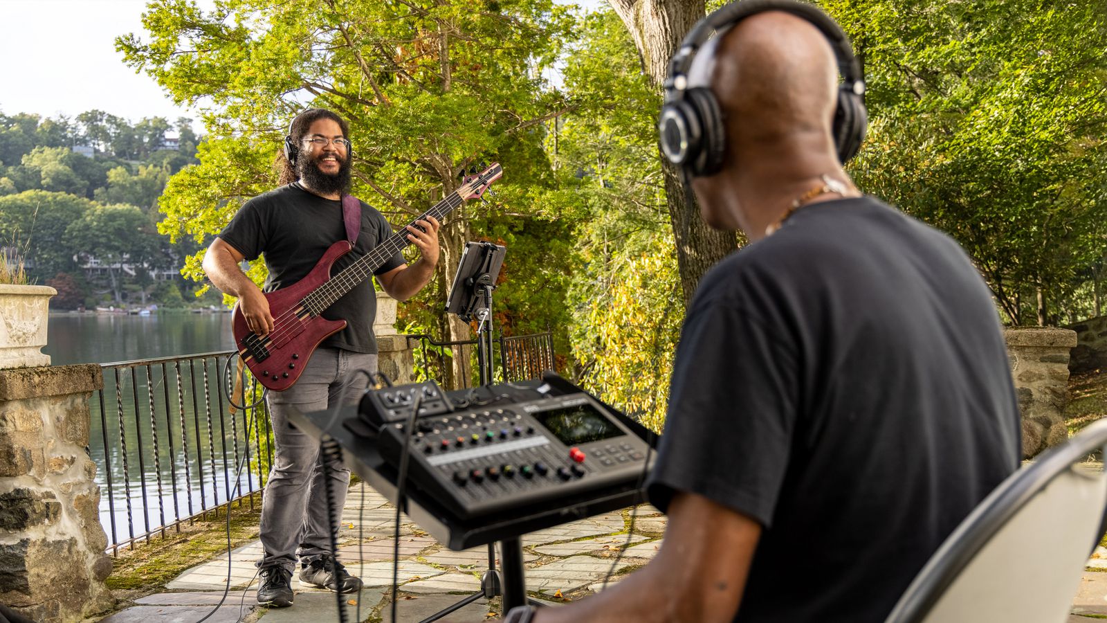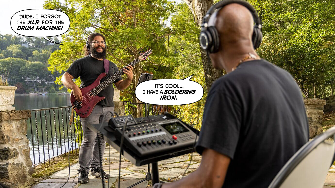 This has to be my favorite pic from the web page. Remember on their Livetrak series when they gave you like four headphone outs. Yeah, you get one here, and they have to use a headphone amp so the bass player can hear what is going on also, haha. This is already looking like a clunky setup. Now wait until people have to get plugging in adapters and maybe some DI boxes and whatnot because of all the XLR inputs.