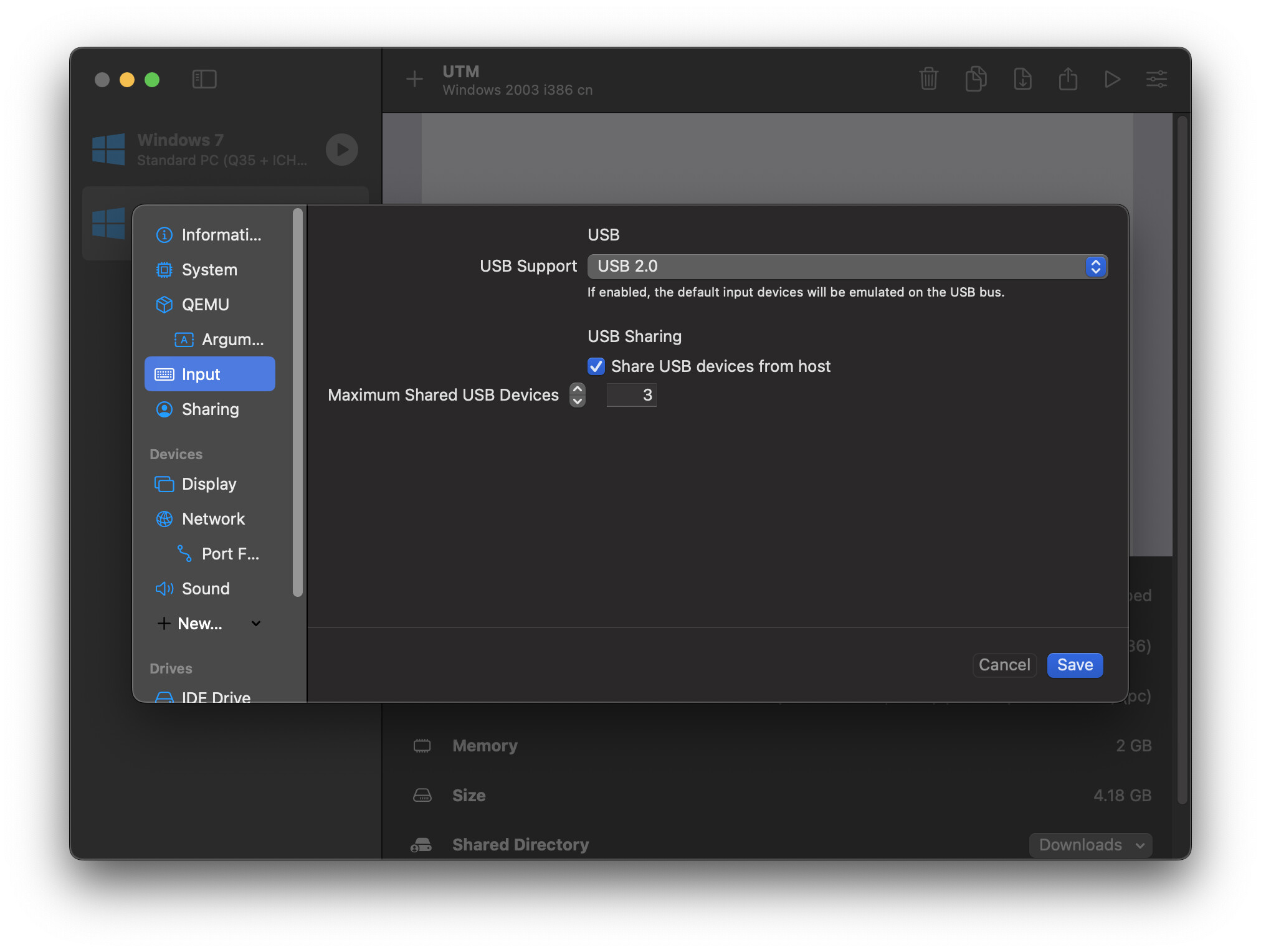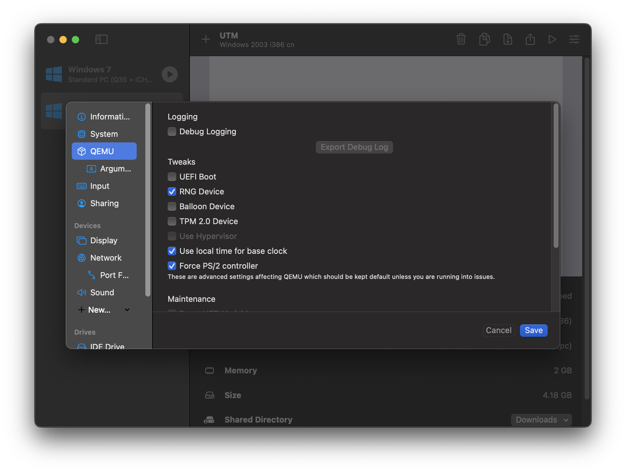 Hi guys, glad to hear more success stories. I want to document a detail setting of making USB sharing work on Windows XP virtual machines for me. First, in “Input” setting, select USB 2.0 and tick “Sharing USB devices from host”. Then “QEMU” setting, tick “Force PS/2 controller”. The reason (from my guessing) is that when enable USB, UTM won’t emulate a PS/2 device by default while Windows XP expecting a PS/2 devcie (otherwise it will not boot). “Force PS/2 controller” will force UTM to emulate a PS/2 device.