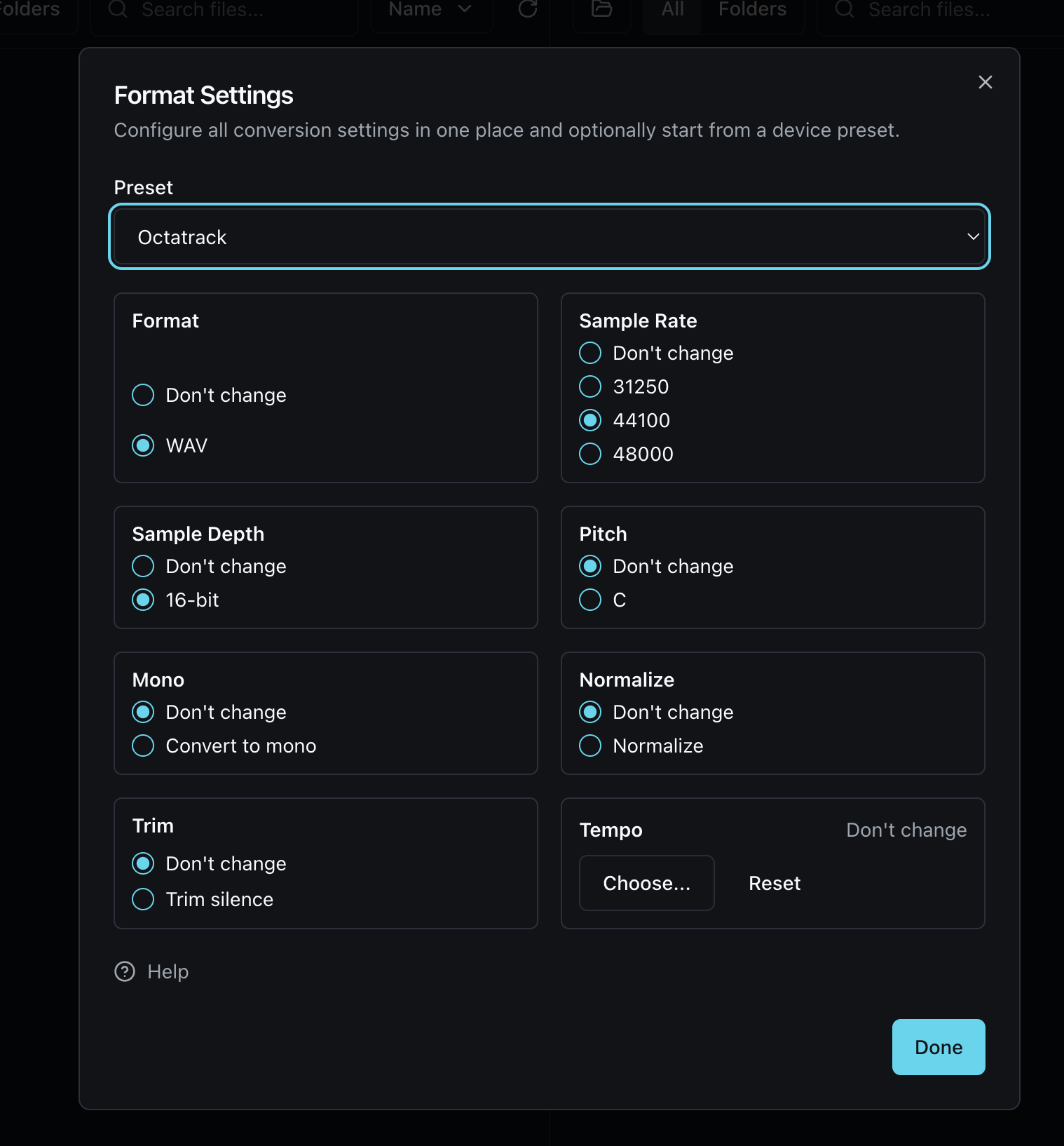 To be clear, these presets only support sample file format. They don’t handle any device limitations regarding sample or filename lengths, etc.