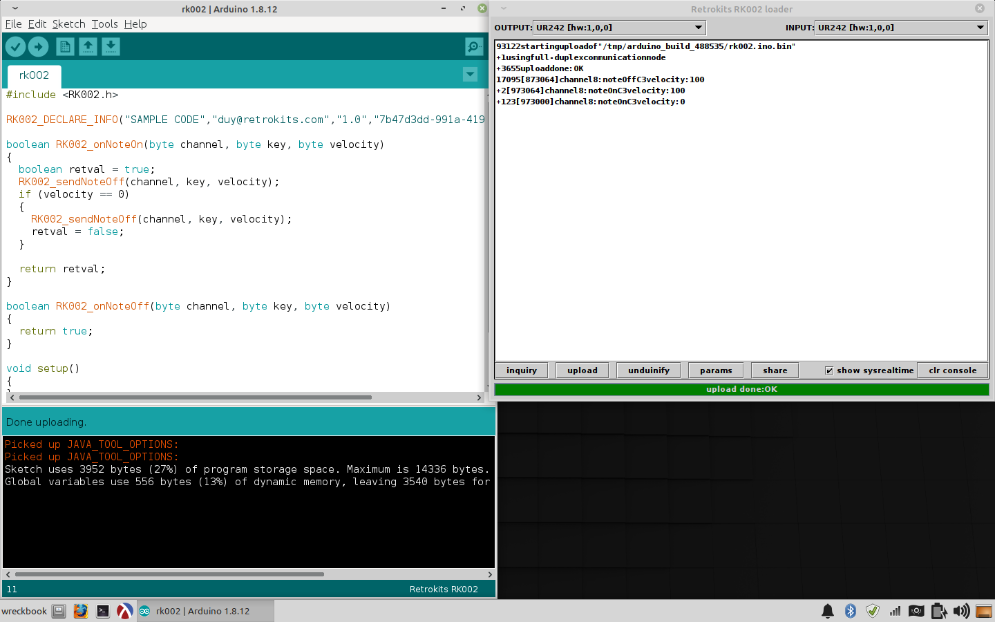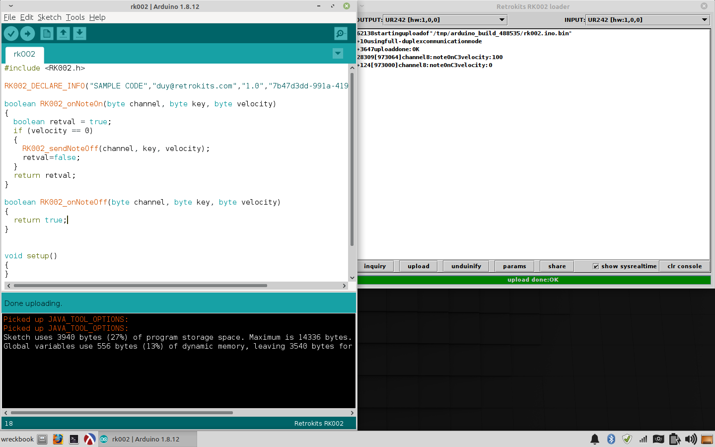 If you need to sequence something with Octatrack, but it starts droneing because the receiving synth does not understand that Midi Note On with Velo 0 means Note Off, you can buy a RK002 from Retrokits, and program it with this sketch: