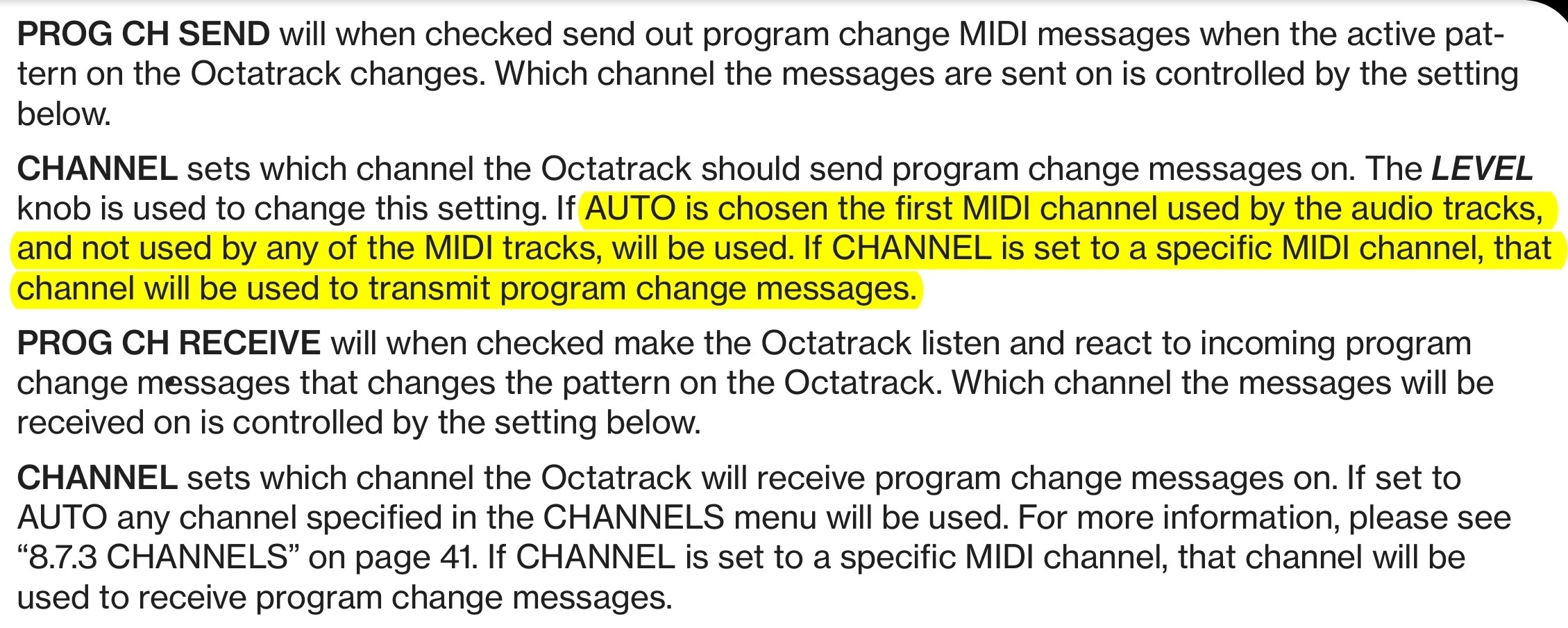 Same rule as AUTO setting in MIDI SYNC page. It doesnāt correspond to AUTO CHANNEL as on other Elektrons, but to the lowest audio track channel (not shared). Confusing, isnāt it ?