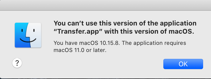 says (correctly) that Transfer 1.10.3 is “compatible with: macOS 11 Big Sur and later.”