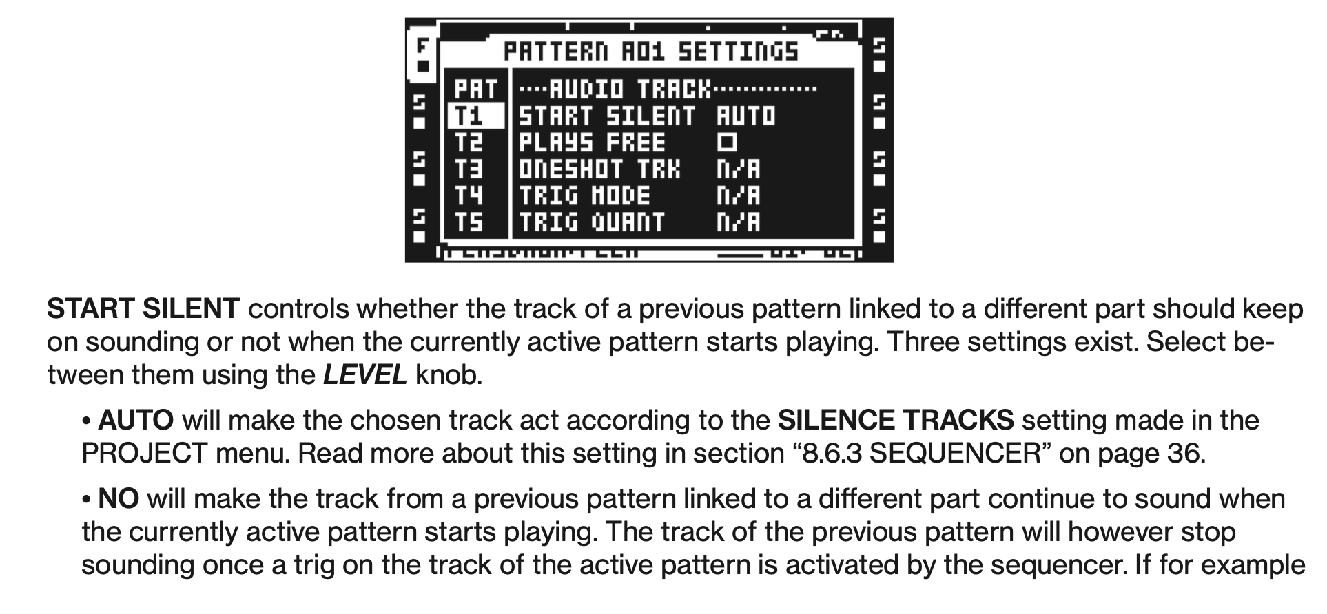 You can utilize the “start silent” feature not only for stopping a sound, but also to force the loading of the track settings from a new part without any trigs on the track at all. That’s quite a useful side effect (which is nowhere documented).