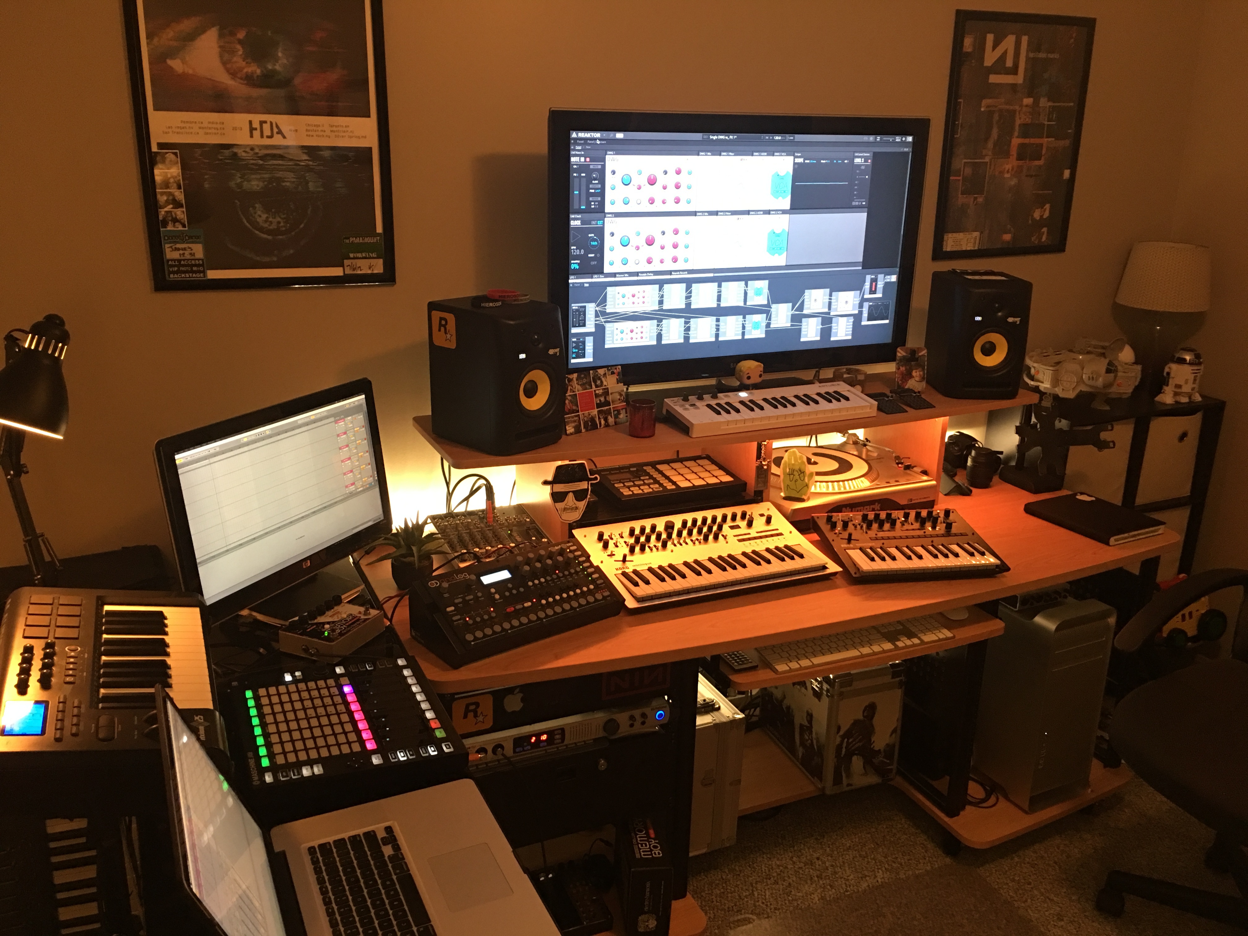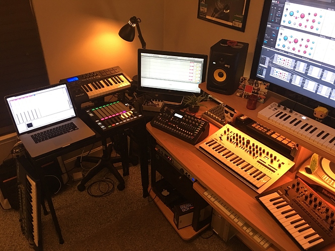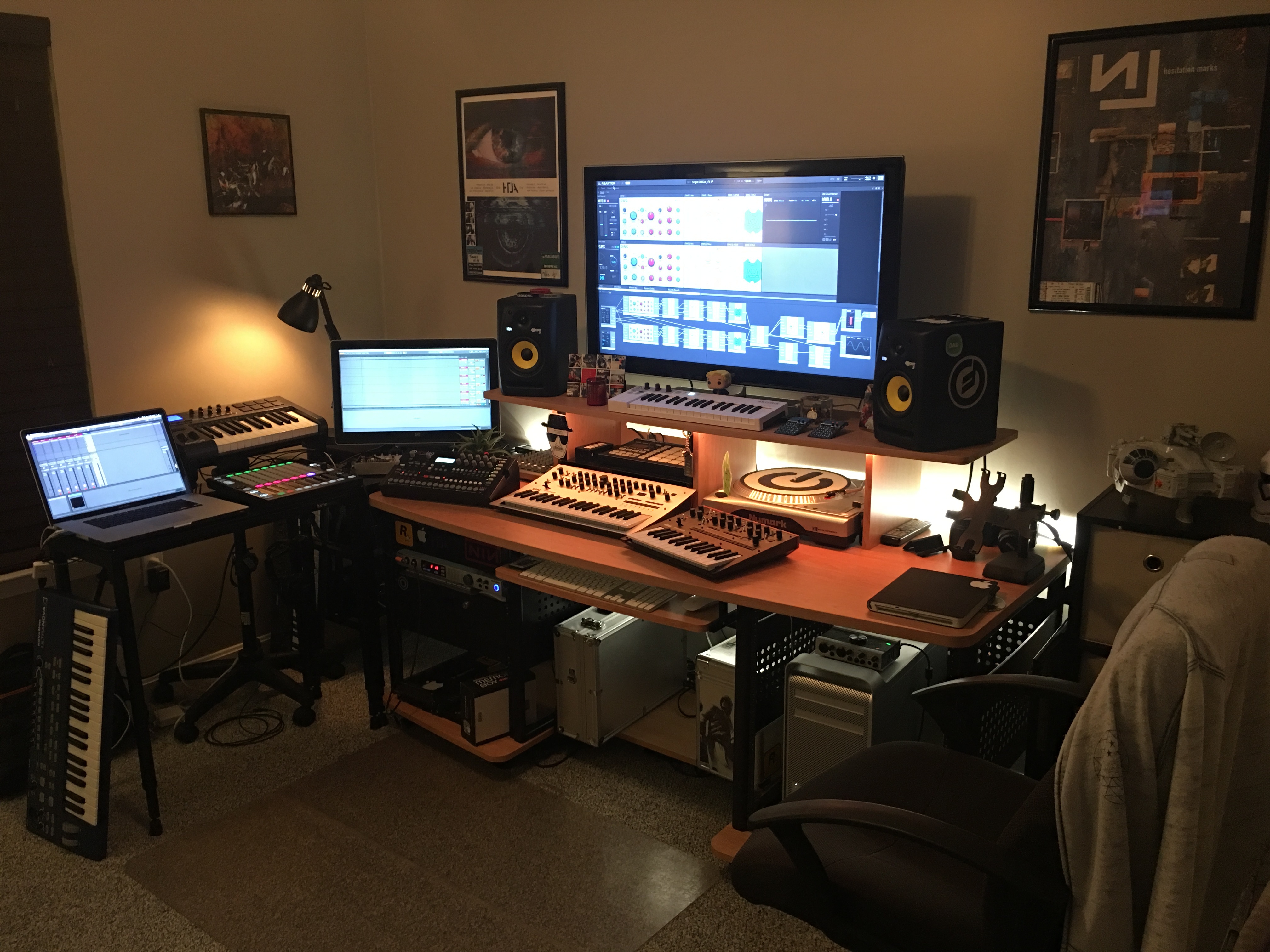 I desperately want to complete the Dark Trinity. Once I have the AR and Octatrack, they will be front and center on the desk. The A4 is technically front and center with this rig because I actually use the MacBook laptop as my primary recording system. It’s more powerful than my Mac Pro tower, which is used as an independent system to run Reaktor Blocks at all times.