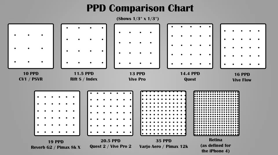 Note that the Quest 2 has a higher PPD that PSVR2 at 20.5, but a lower FOV at 90 degrees vs 110 on the PSVR2.