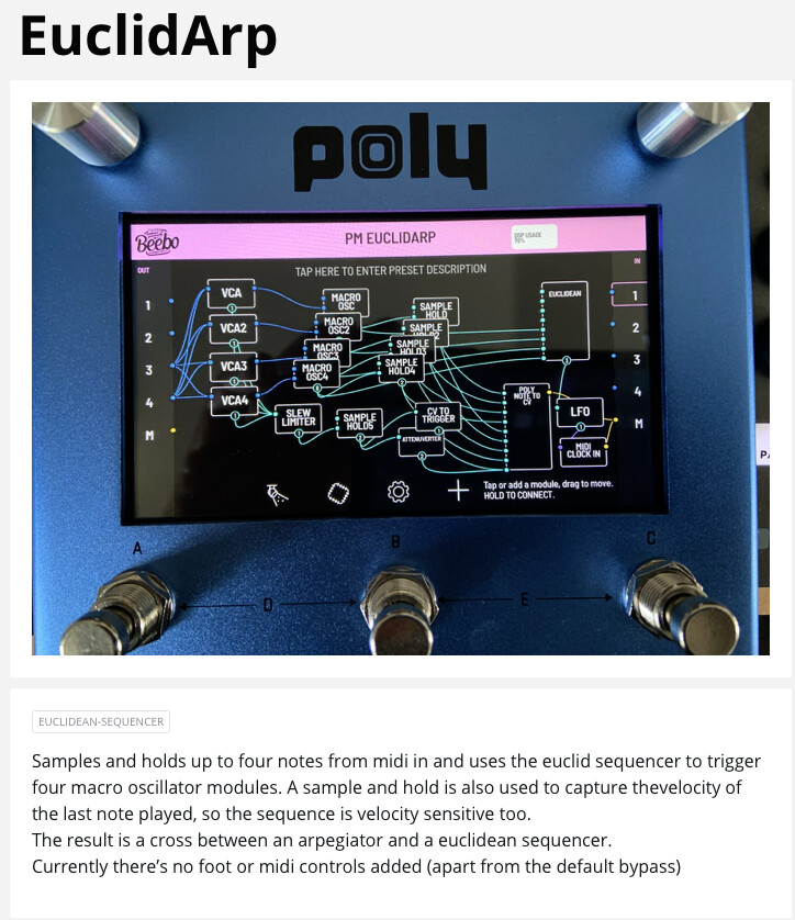 Patch storage has a bunch of Beebo patches, including that Euclid Arp patch: Explore | Patchstorage (they’re in the “Digit” category, that probably could do with being renamed “Beebo” now)