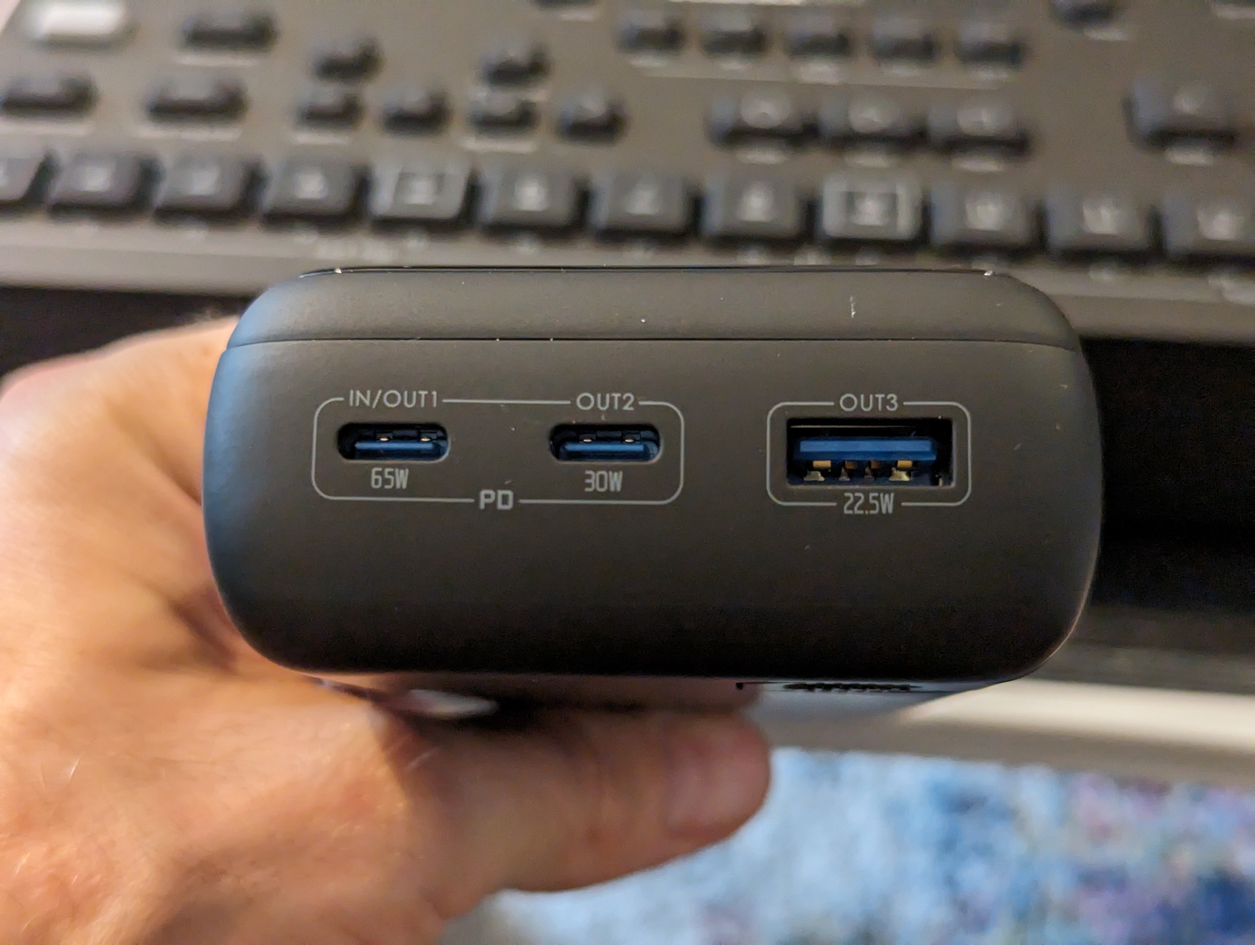 It also has power through ability, so if you plug it in, it will provide ~45W to the power bank and assuming your devices connected use less, keep the power bank topped up, so it can serve as an 2, 3 or even 4-in-1 power supply for your devices as well (you do loose either the DC or one USB-C port when in power-through mode).