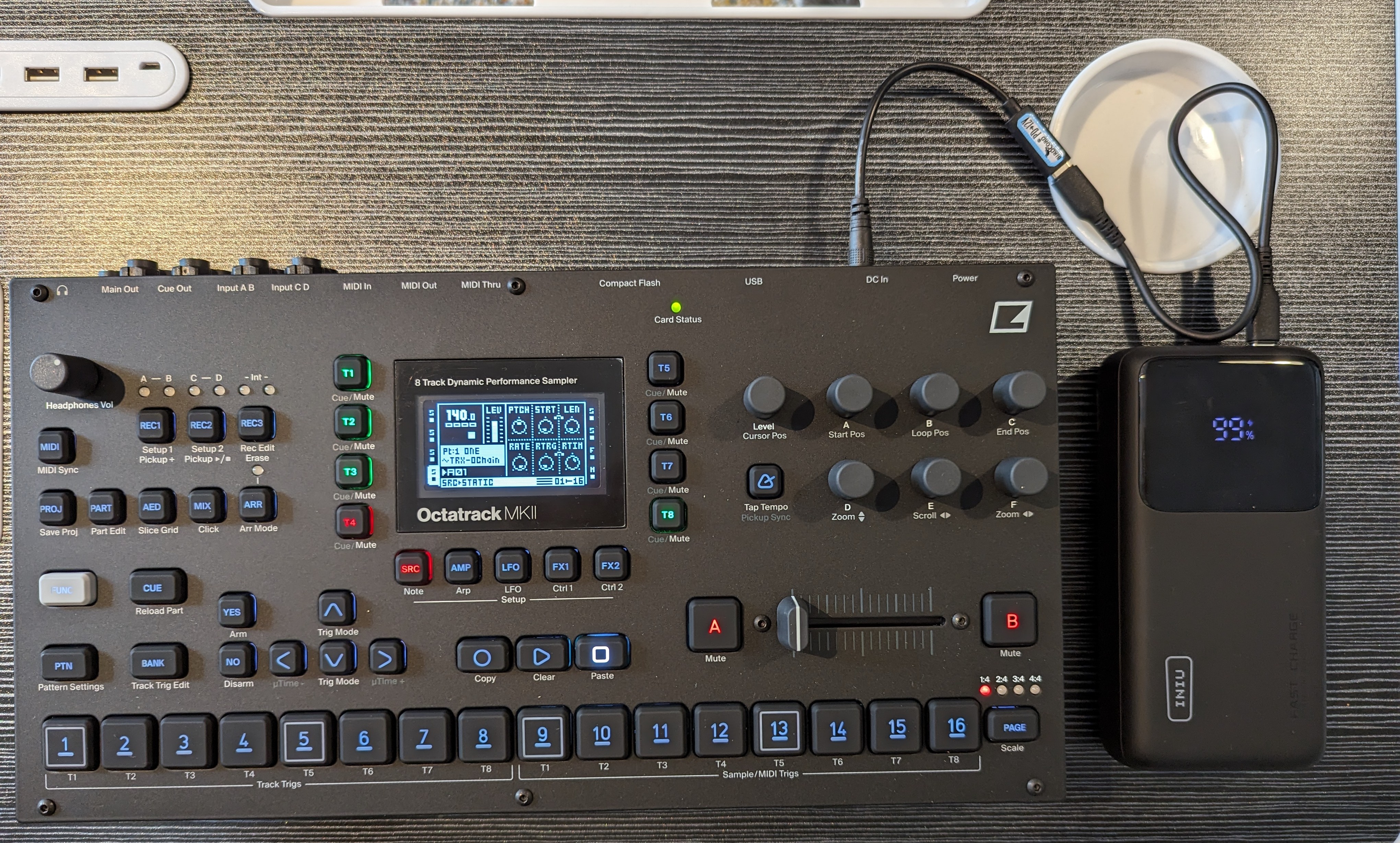 I just received the new Sandberg All-in1 Laptop Powerbank 24000. I have 3 Elektron devices that require 12V at 1 or 2A and it should be possible to power all 3 at the same time (potentially even up to 5!). Thereās a 2.1mm DC out port that support 12V at 4A, so with a DC splitter and 2.5mm adapter you can power two Elektron devices. The two USB-C ports support PD at 12V/3A each. And the USB-A supports 5V at 4.5A.