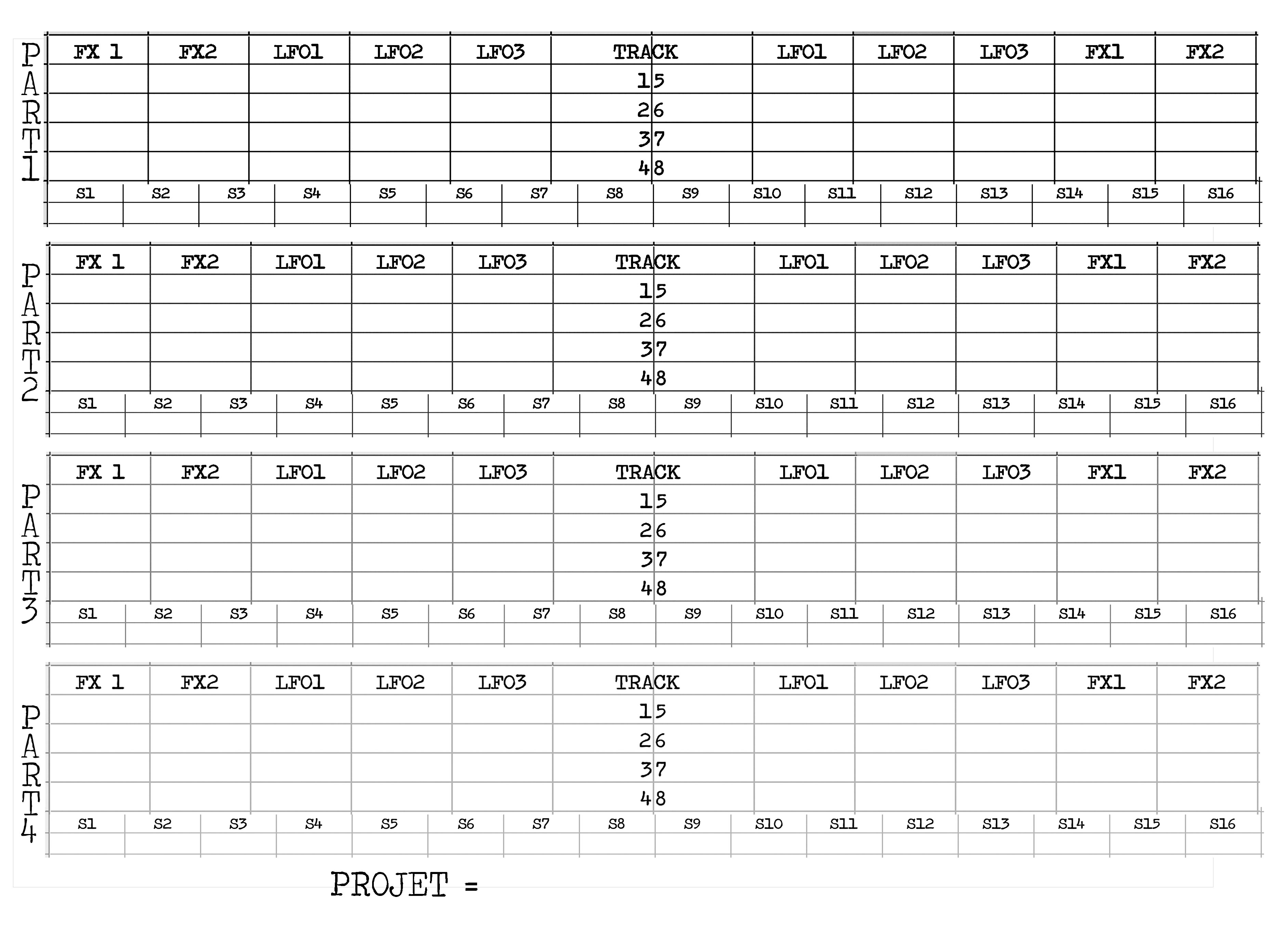 I’m a fairly new owner of this fine machine and I’m in the process of adapting my Ableton Live set into an Octatrack set. I found it really easy to lose track of what was assigned where, particularly in regards to my Scenes and Parts. I decided it would be helpful to document it all in a spreadsheet to keep track of it all. Often just writing things down helps to solidify things in my mind, but being able to easily reference it would be handy too. I also felt that establishing a consistent schema for my Parts and Scenes would prevent me from getting lost and causing undesirable surprises.