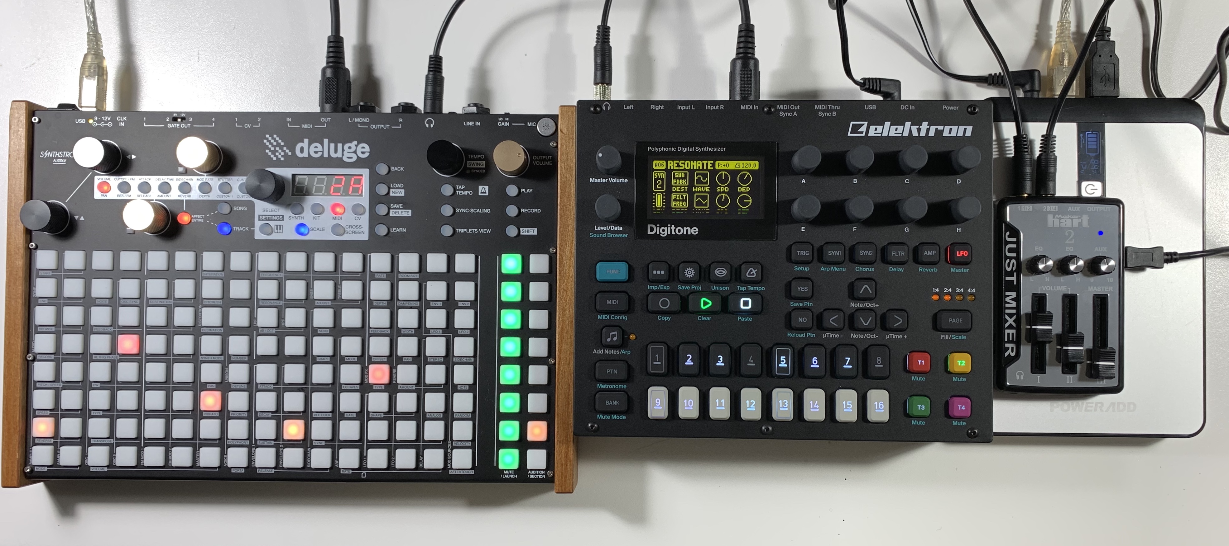 Here’s my portable rig for the trip. 23000mAh poweradd battery powers Digitone and mixer and charges Deluge as needed. IEMs plug into the mixer and I’m good to go!