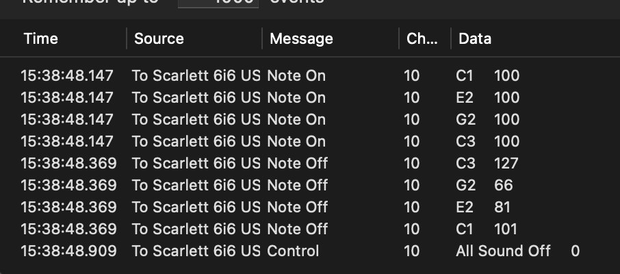 I’m attaching a screenshot of a part of the sequence I’d like to record into Digitakt, and a Screenshot of the midi monitor of how my interface outputs MIDI data when playing a chord thats quantized with fixed length and velocity.