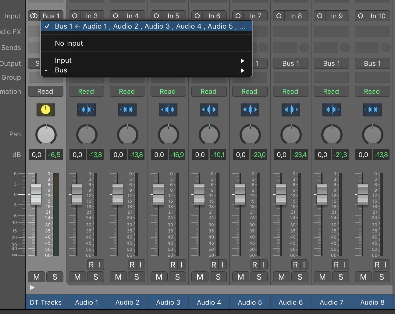Pressing Track 6 on DT sends output to DT1, DT2, DT8